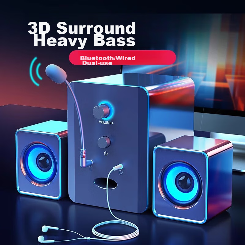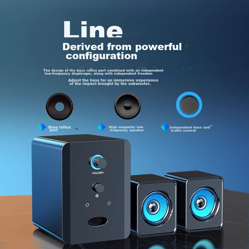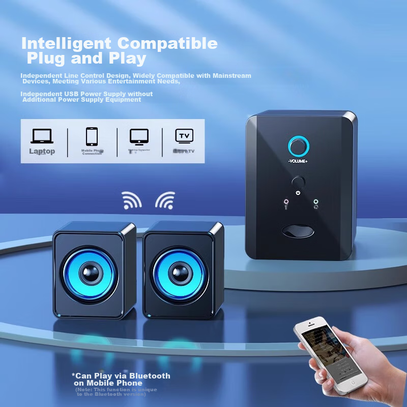 6 major features: computer speakers, 5.0 Bluetooth chip, cold tone knob light, STEREOSC, TEREOSC, RROUND, 88, independent subwoofer, intelligent compatibility, independent knob, NDSOPO, PICSURR, SOUND