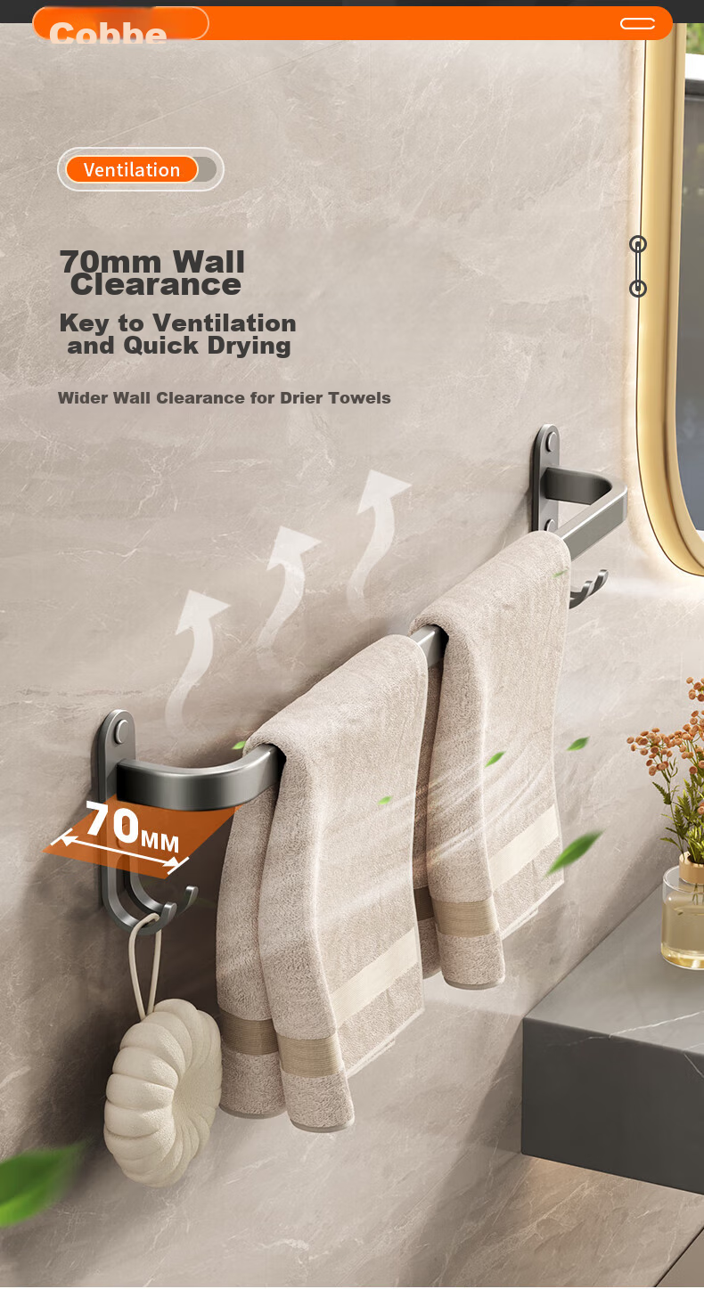 **Ventilation:** 70mm distance from the wall for quick drying of towels