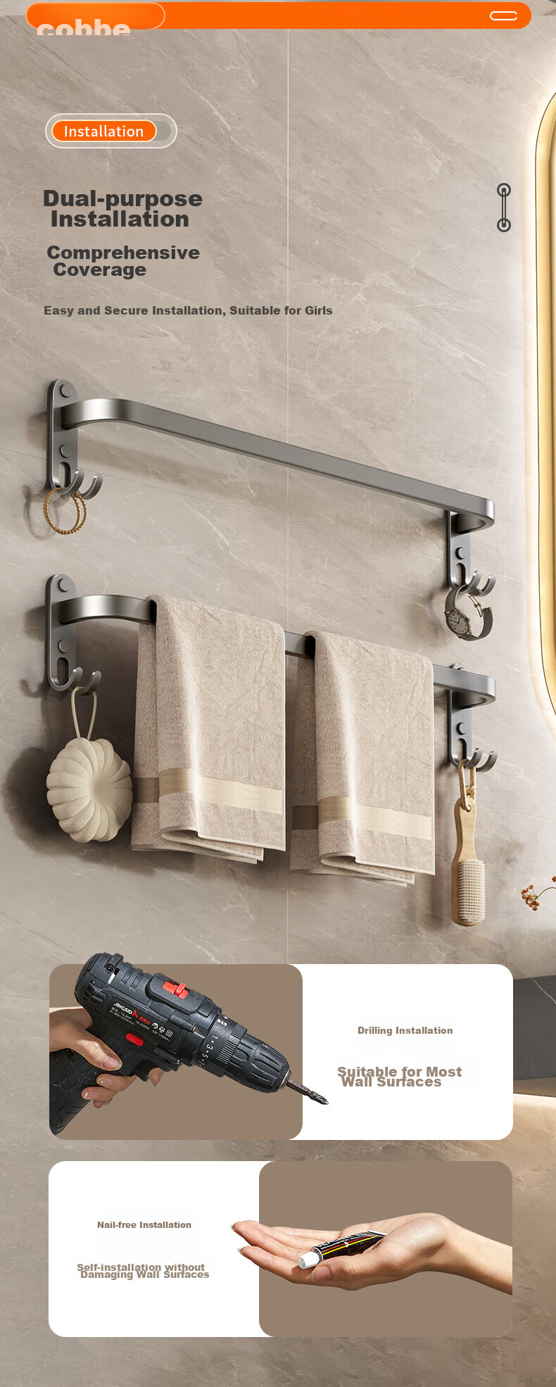 **Installation:** Dual-use installation, suitable for most wall surfaces, easy and secure installation with drilling or nail-free options