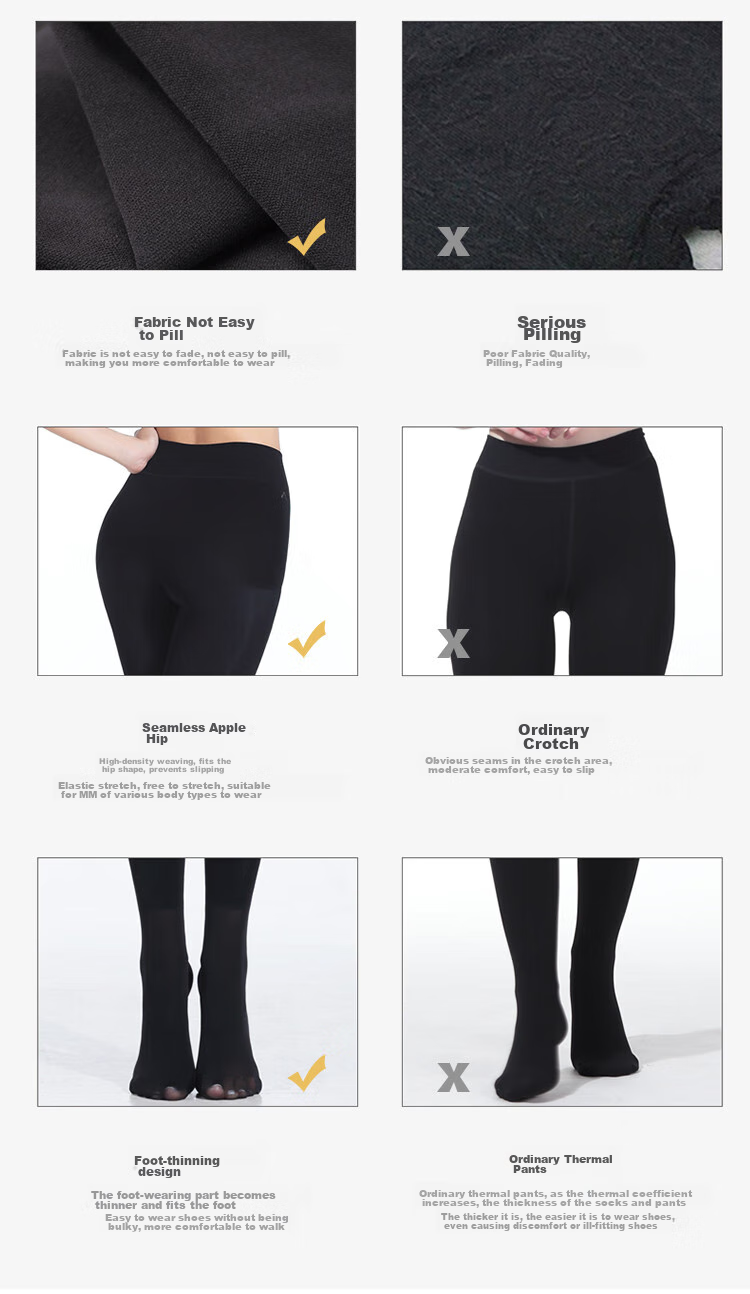 Benefits: Provides warmth without bulkiness, enhances leg appearance, slimming effect