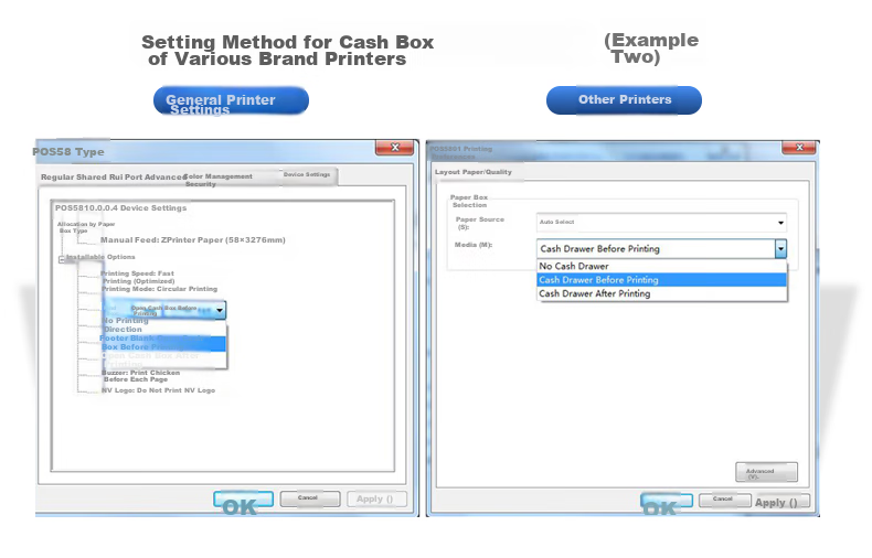 - **Scenario 2:** Various printer cash drawer settings - General printer settings for POS58, POS5801, etc.