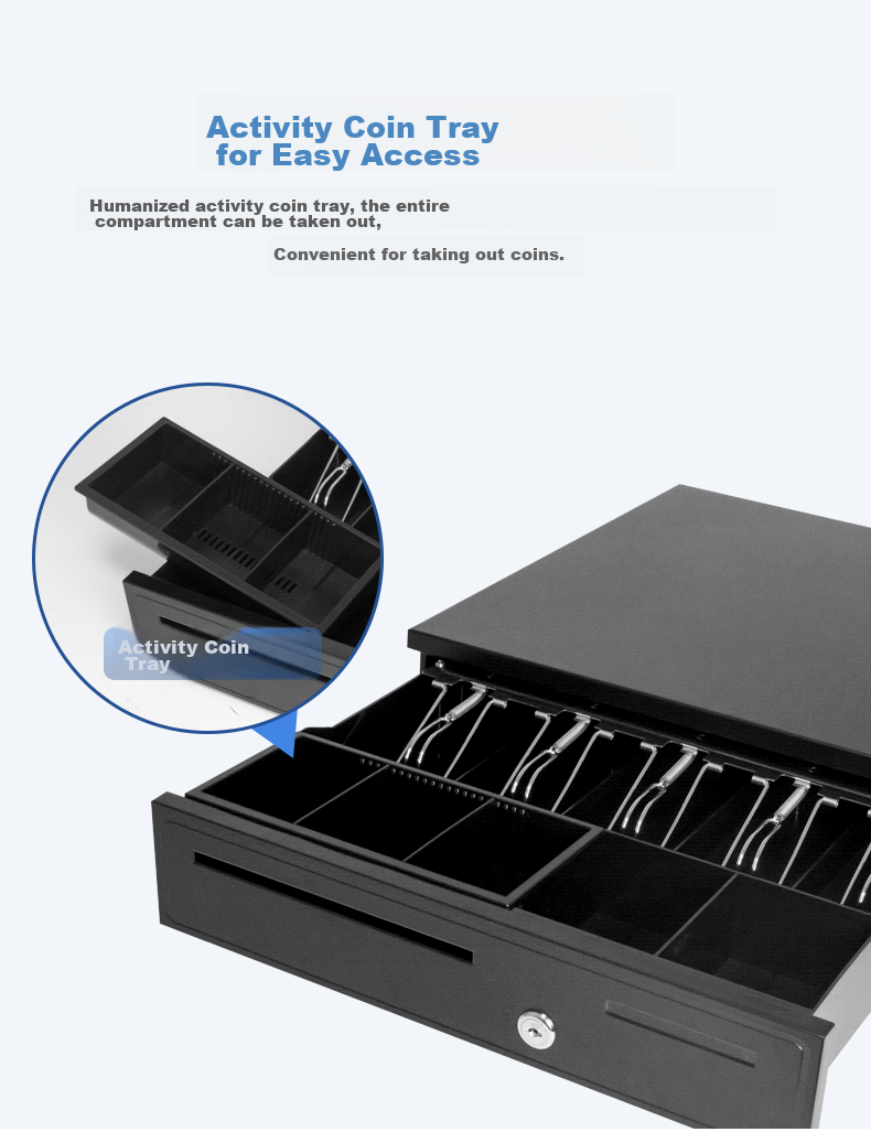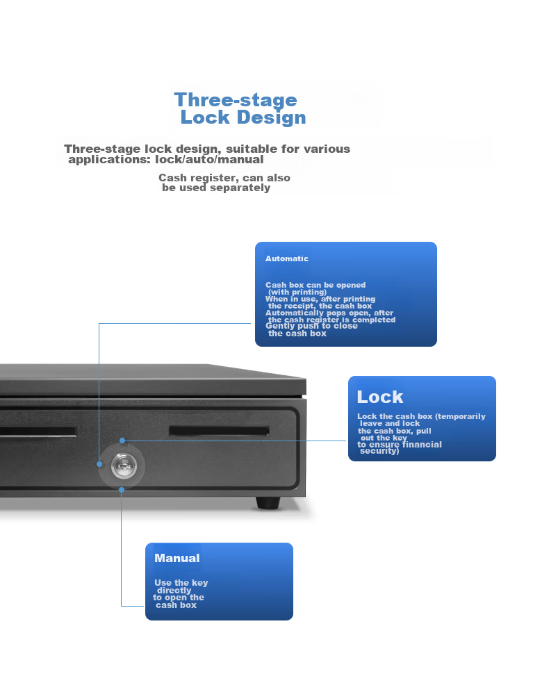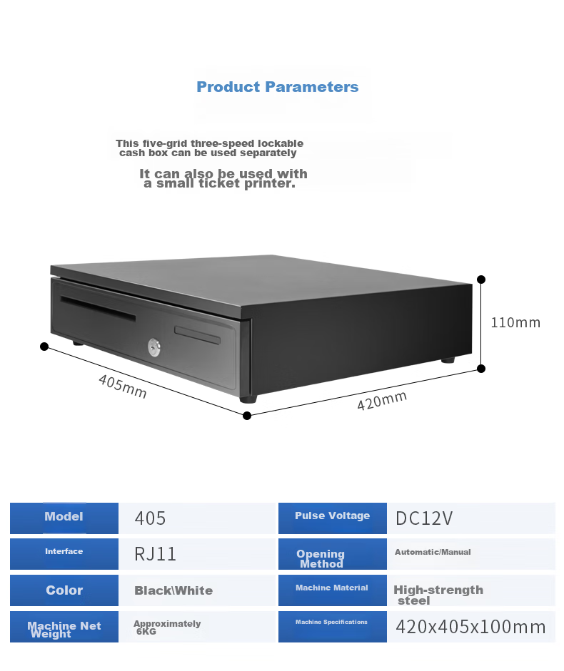 **Description:** Five-grid three-speed large capacity cash drawer, suitable for use with computerized cash registers. Can be used independently with a key. Made of integrated steel material, sturdy and durable. Three-lock design for locking/automatic/manual operation suitable for various cash registers. Can also be used separately. Automatic opening of cash drawer (when used with a printer, the cash drawer automatically pops open after printing a receipt; gently push to close after cash transaction). Locking feature to secure cash (temporarily leave and lock the cash drawer, remove the key to ensure financial security). Manual operation allows direct opening of the cash drawer with a key. Removable coin tray for easy access to coins. Bottom of the cash drawer made of metal steel plate for increased durability and security. Cash drawer interface for standalone use with key opening or connection to receipt printer and POS system. Anti-slip foot pads for stability and shock absorption.