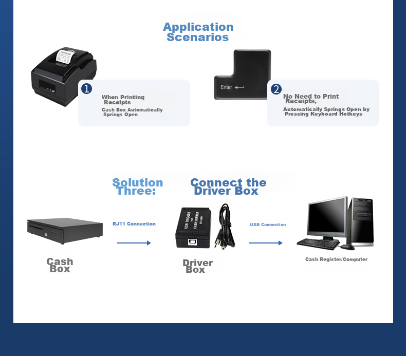 - **Scenario 1:** Printing receipts - Cash drawer automatically opens when printing a receipt or using a hotkey on the keyboard.