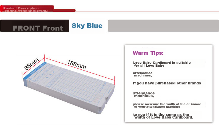 **Product Description:** Aibao card paper suitable for all attendance machines. Front side is sky blue, dimensions 188mm x 85mm.