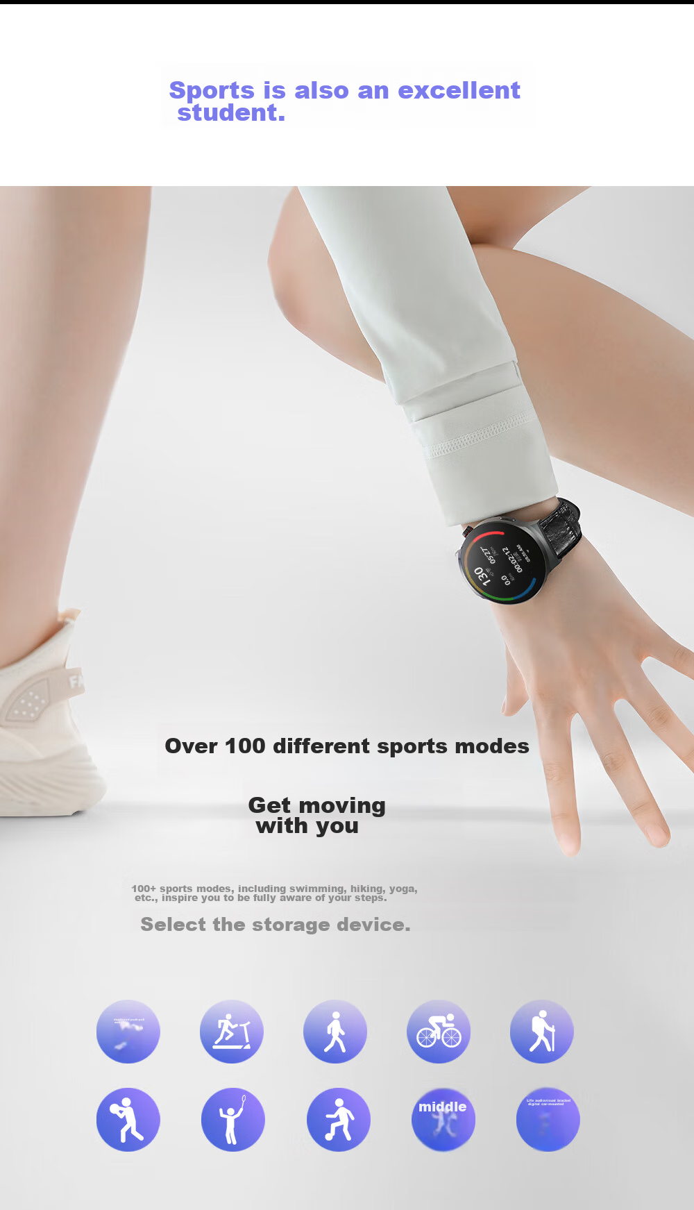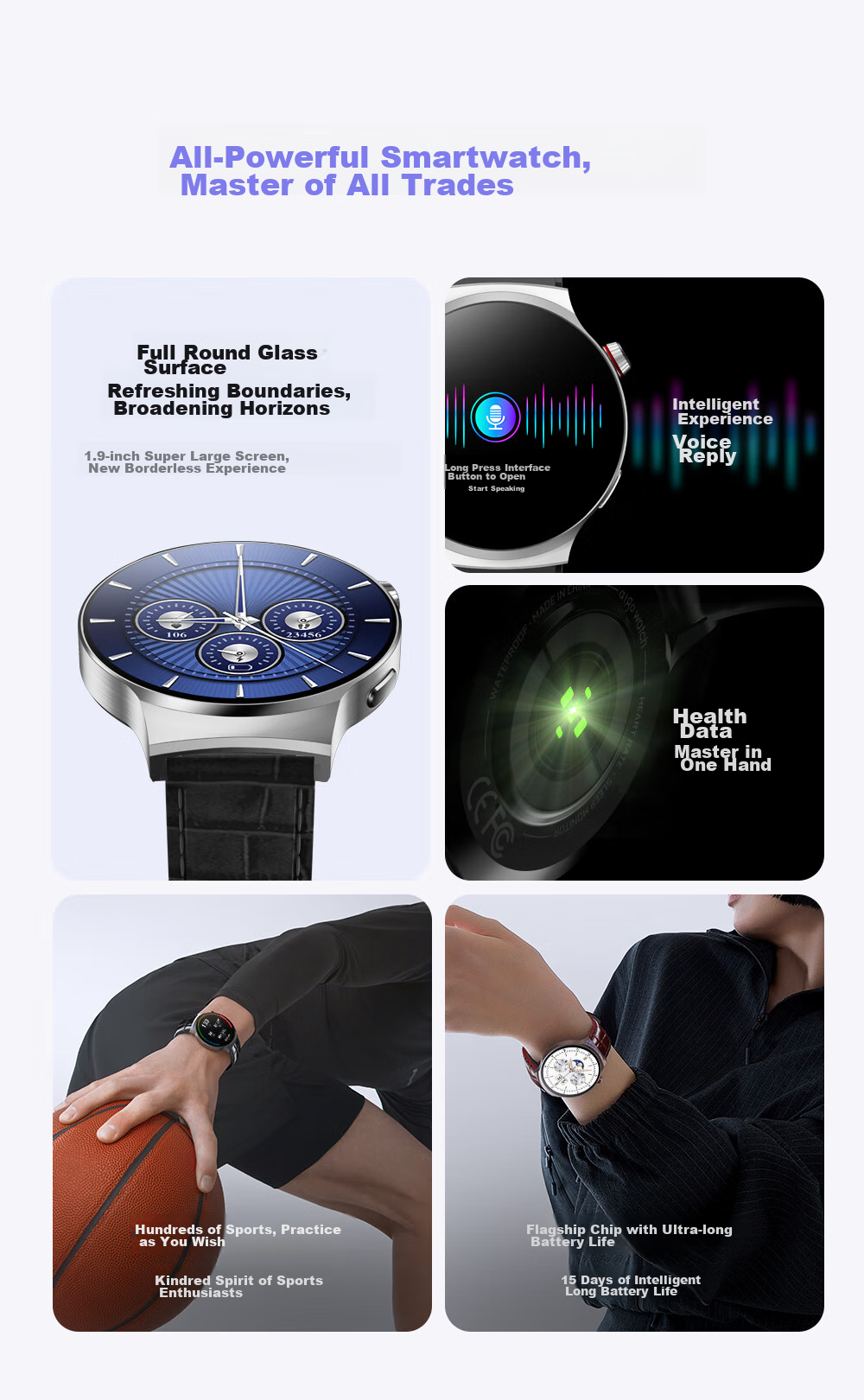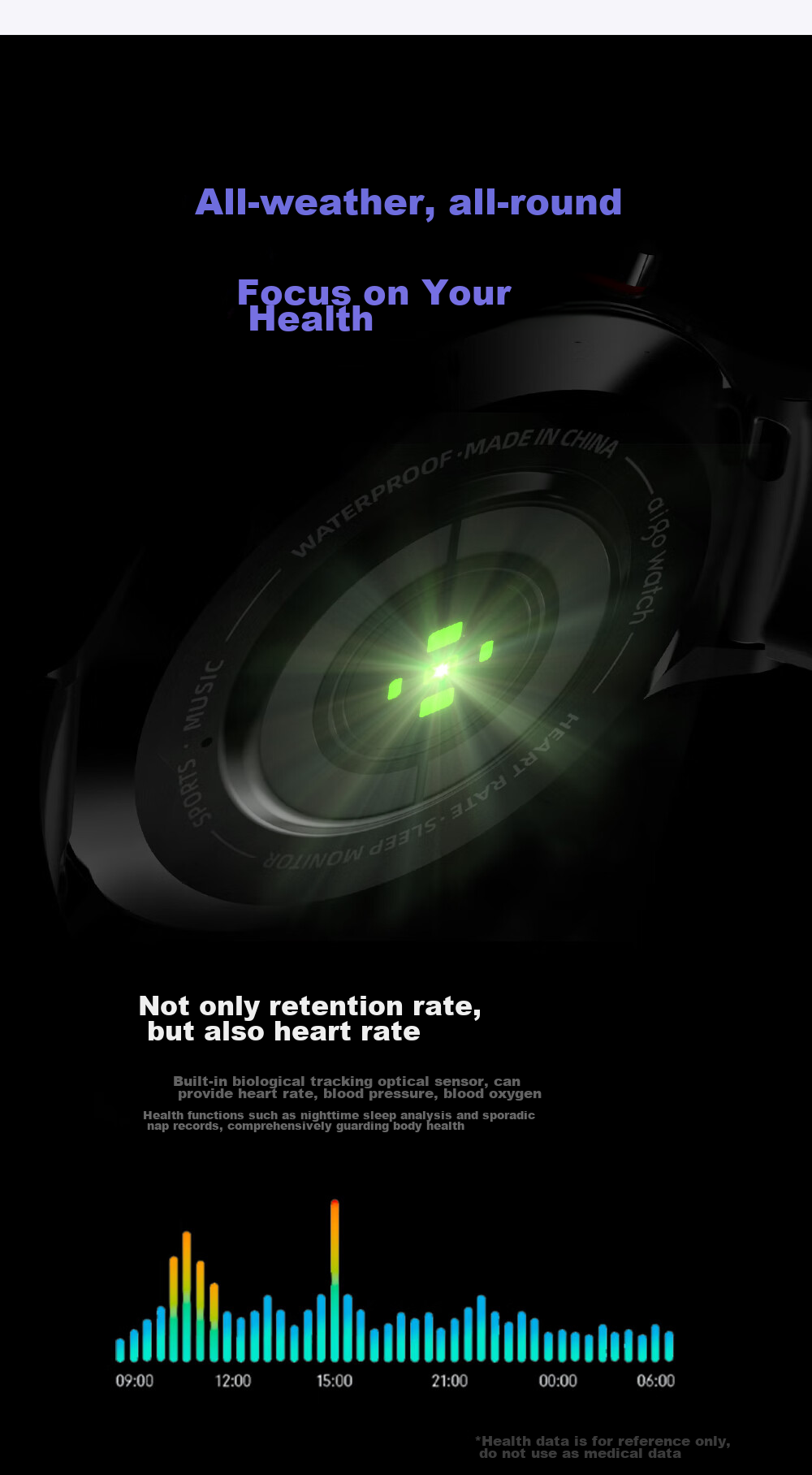 Features: Heart rate monitoring, waterproof, scratch-resistant, long battery life, Bluetooth connectivity, health tracking (heart rate, blood pressure, blood oxygen, sleep analysis), 100+ sports modes, smart notifications, payment code, social business card, navigation, music playback