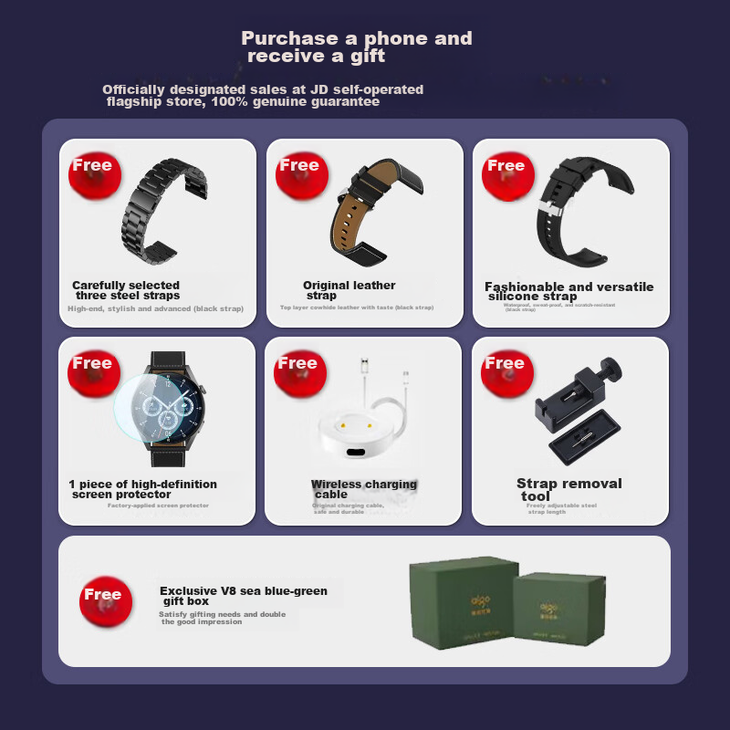 Included Accessories: Three high-quality steel straps, original leather strap, fashionable silicone strap, high-definition screen protector, wireless charging cable, strap removal tool, V8 exclusive gift box