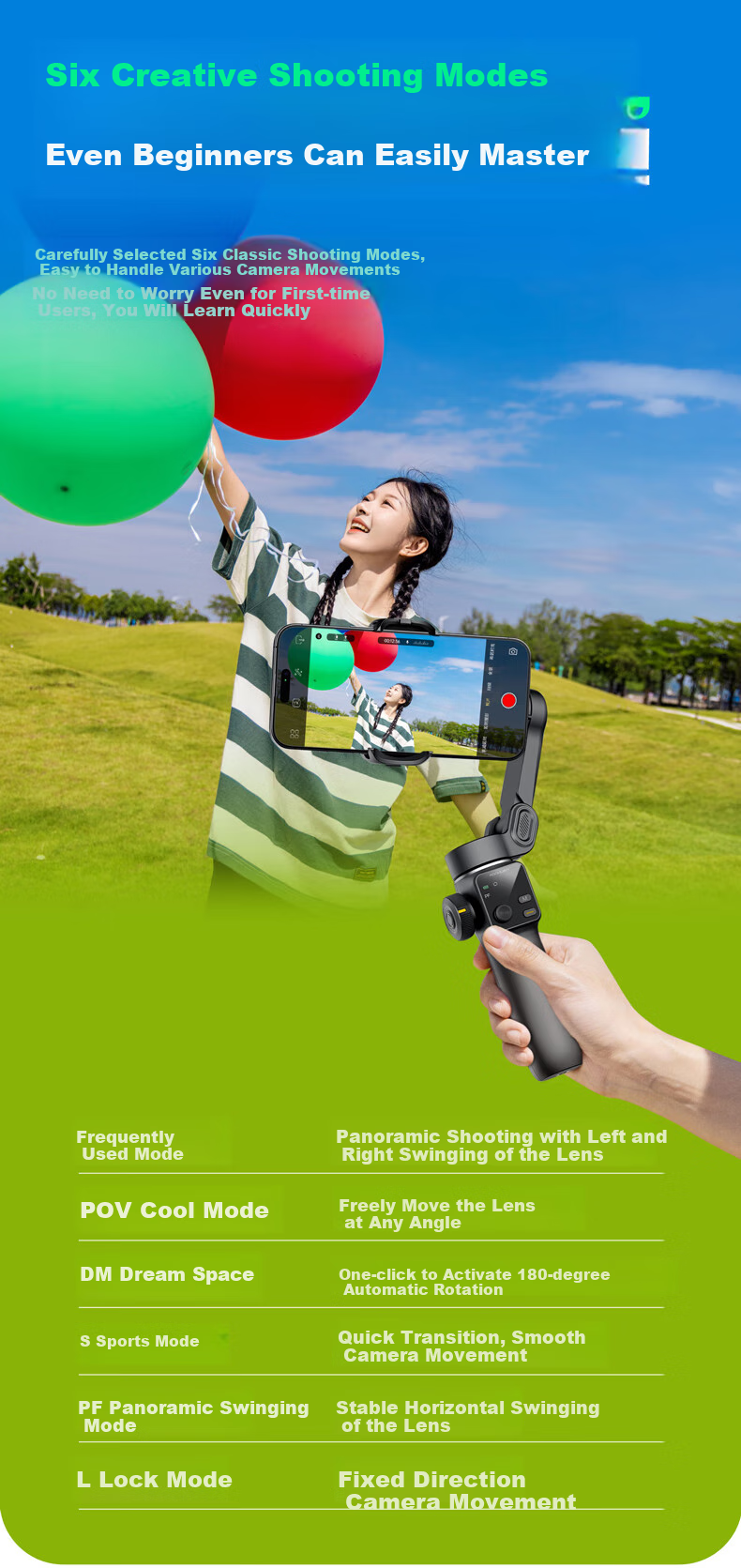 Experience a new level of creativity and stability with AOCHUAN ISMARTV8 handheld stabilizer. Capture stunning shots effortlessly with advanced features such as automatic rotation, panoramic shooting, and intelligent tracking. Choose from a range of shooting modes and enjoy the convenience of gesture control. Available in stylish Midnight Black, Pure White, and Polar White color options.