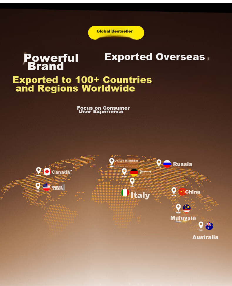 **Global Reach:** Exported to 100+ countries and regions worldwide including the UK, Russia, Canada, Germany, USA, Italy, China, Malaysia, Australia