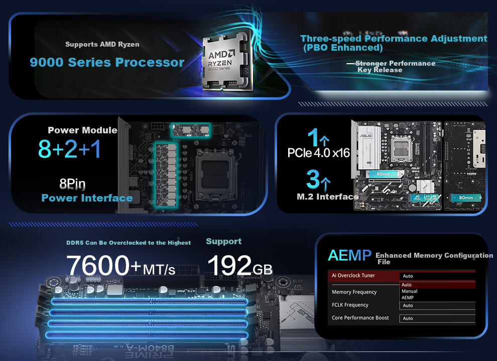 Supports AMD Ryzen 9000, 8000, and 7000 series processors, dual-channel DDR5 memory, AMD EXPO㎡ technology, and PCIe 4.0 for gaming and content creation experiences.