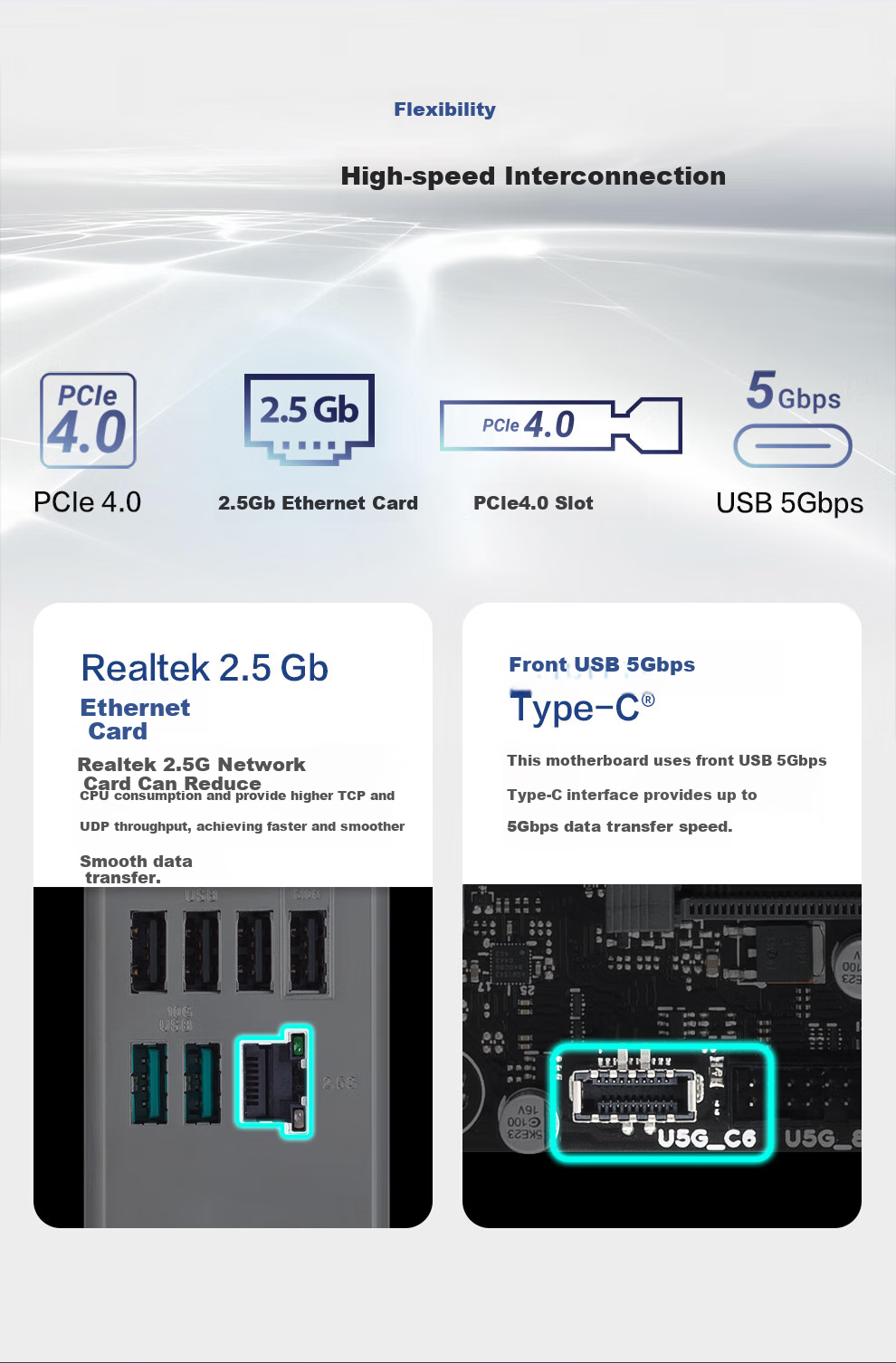 Front USB 5Gbps ports, Realtek 2.5Gb Ethernet, and Type-C interface for faster data transfer speeds