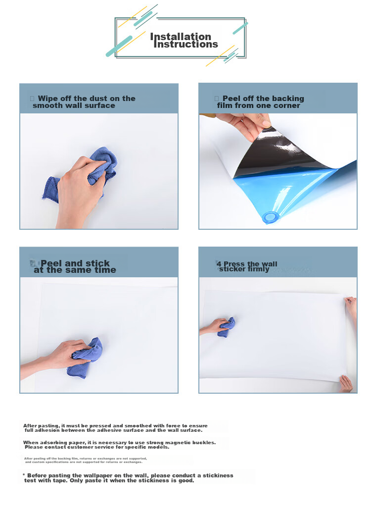 **Installation:** Clean the wall surface, Peel off the backing film, Stick and press firmly, Use strong magnets for paper attachment