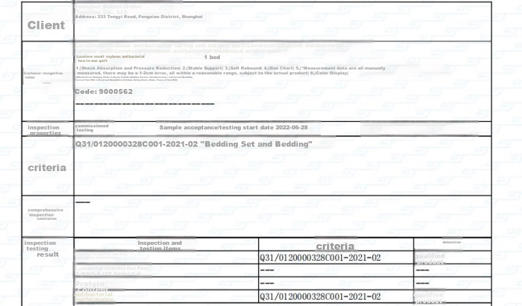 **Report Number:** Q31/0120000328C001-2021-02, confirming compliance with bedding and textile regulations.