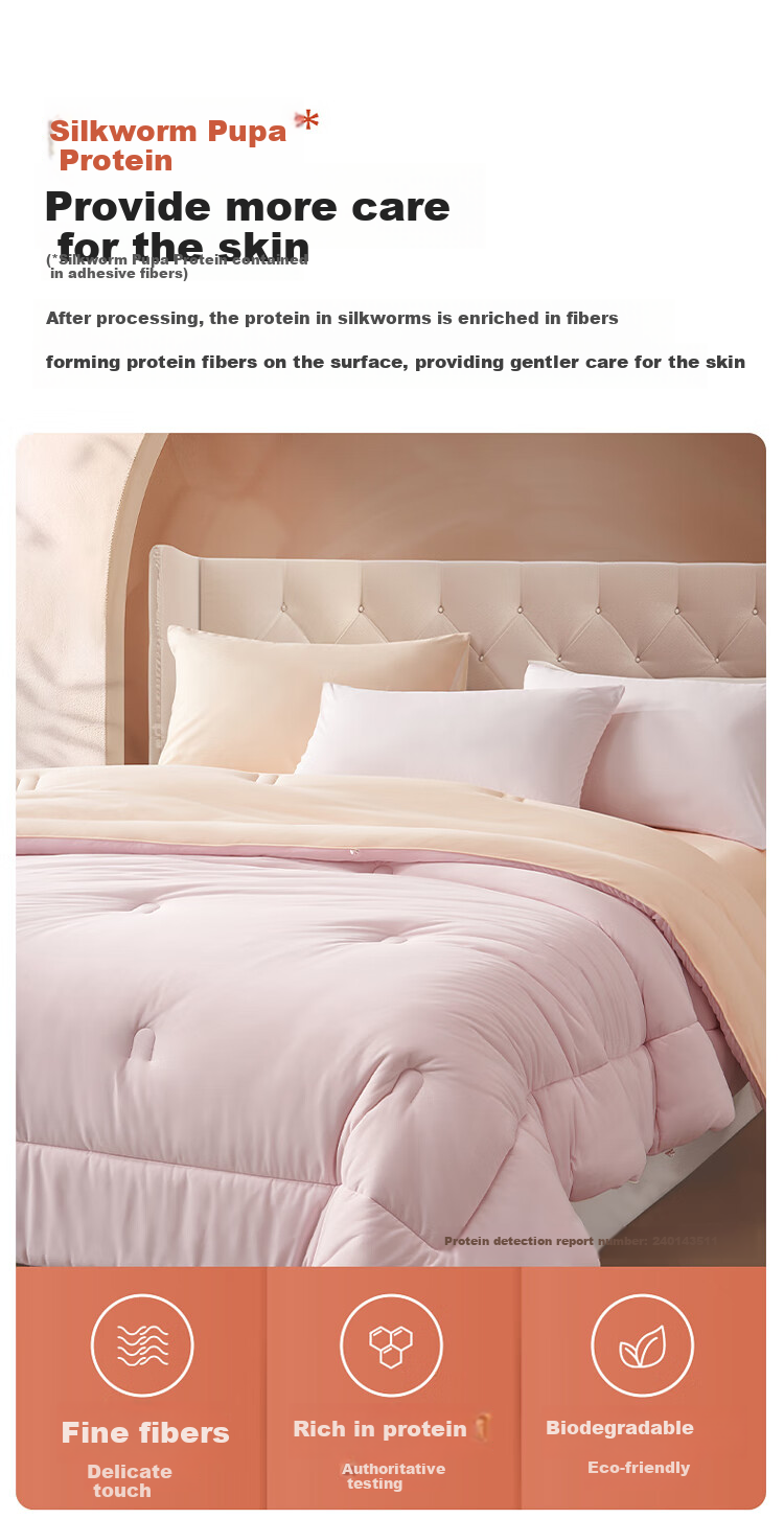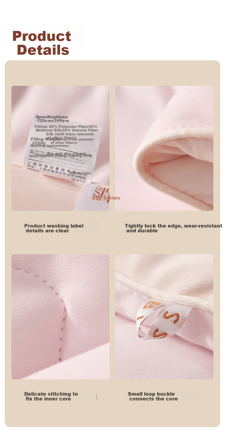 **Composition:** Mulberry silk, silk protein, fluffy fiber, and polyester fiber for a soft, warm, and plush feel.