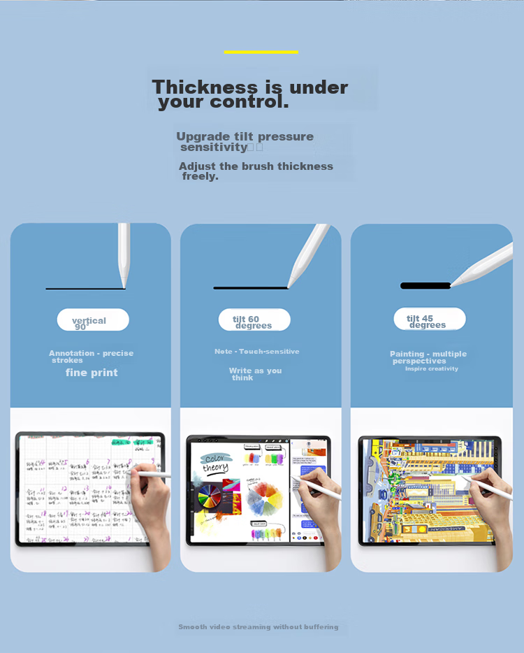 Tilt Pressure Sensitivity: Adjustable brush thickness with vertical 90°, tilt 60°, and tilt 45° angles