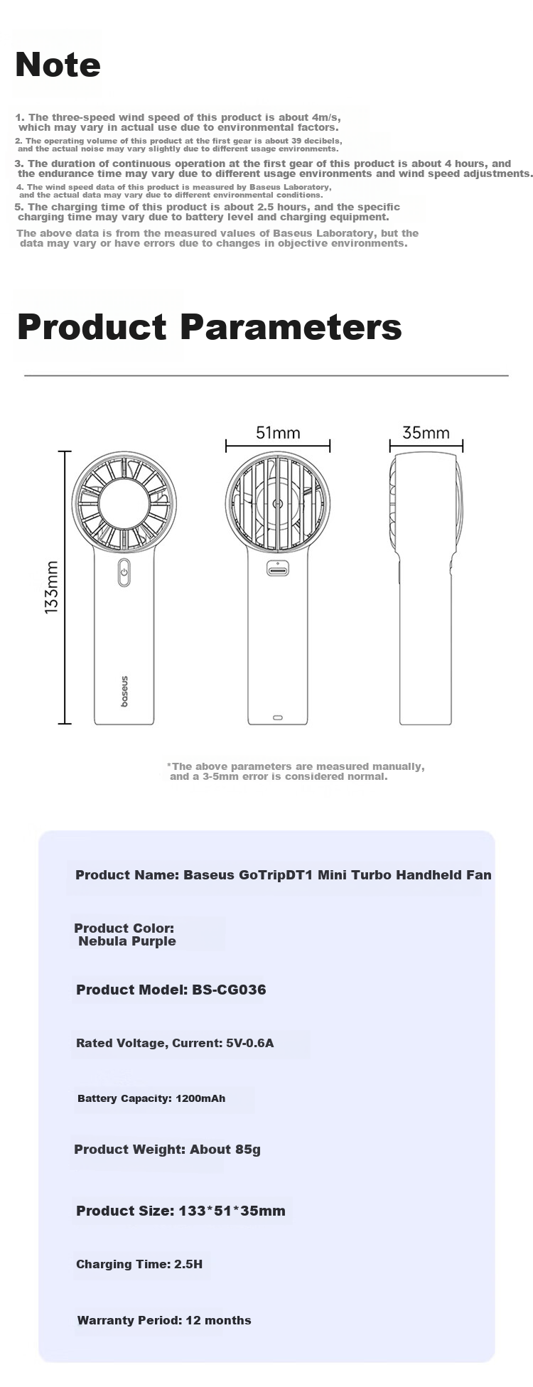 **Product Name:** Baseus GoTripDT1 Mini Turbo Handheld Fan