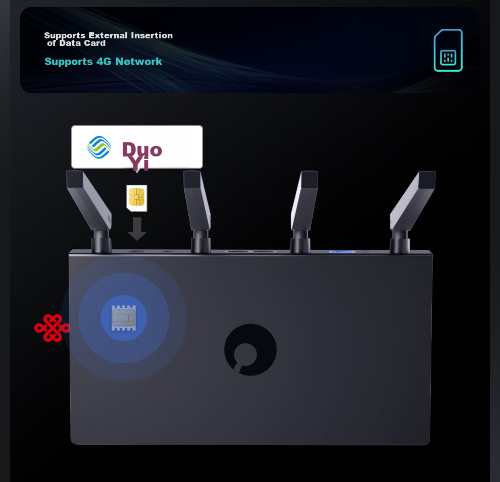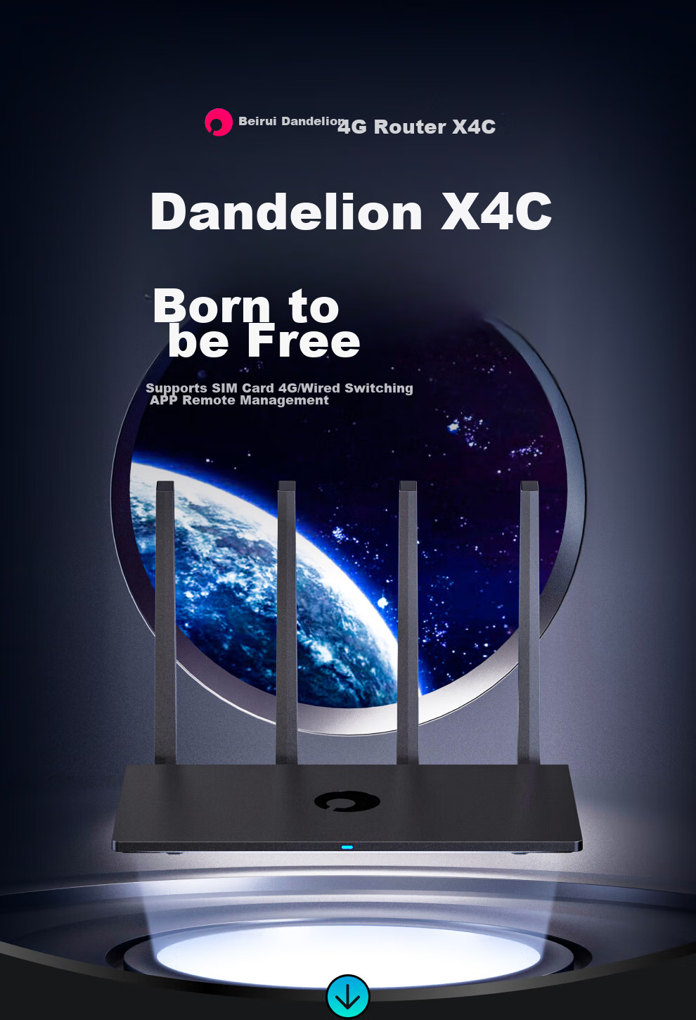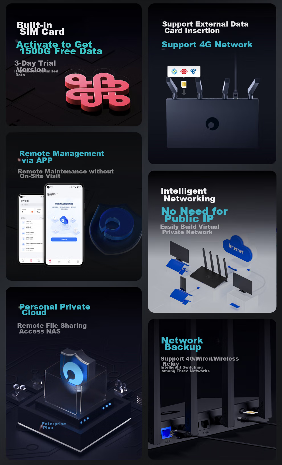 **Features:** Pugongying X4C, born for freedom, supports SIM card 4G/wired switching, remote management via app. Built-in SIM card, external data card supported, comes with 1500G activation data, supports 4G network, 3-day trial version, high-speed unlimited data, remote device maintenance without on-site visit, intelligent networking, private cloud, remote file sharing and NAS access, network backup, supports 4G/wired/wireless relay, intelligent switching among three networks, enterprise-grade.
