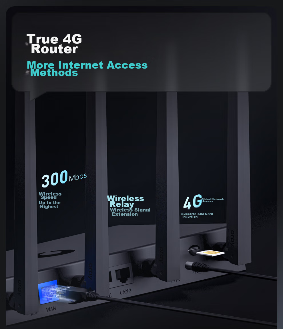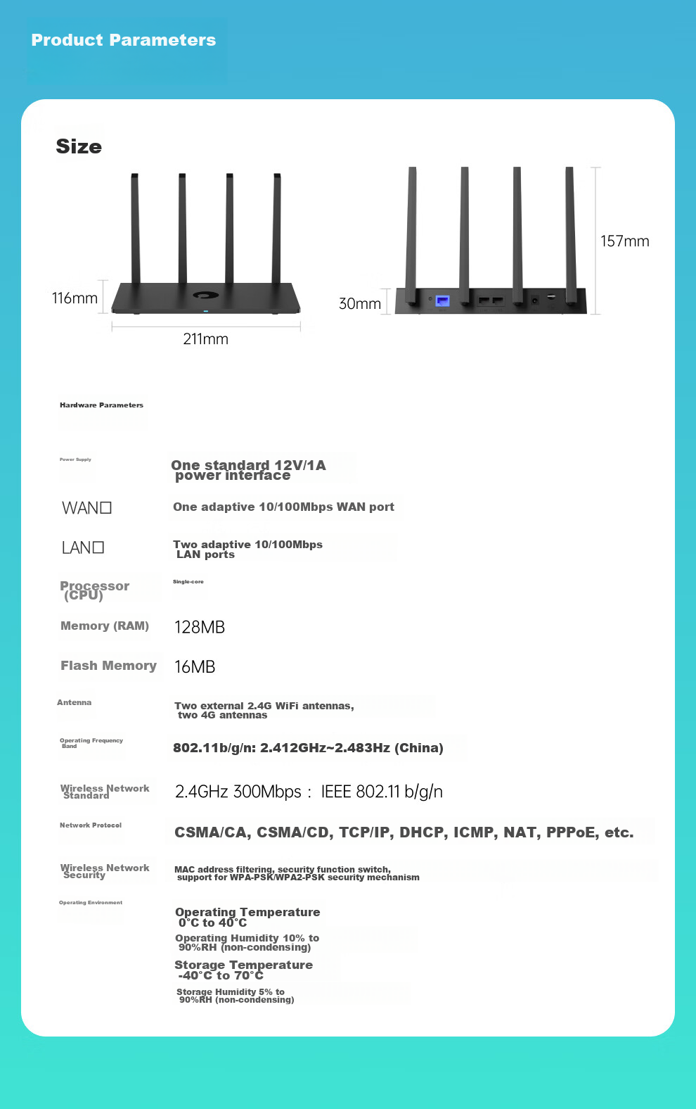 **Network Connectivity:** True 4G router, multiple internet access methods, wireless speed up to 300Mbps, supports wireless relay, 4G network with maximum coverage, wireless signal extension, SIM card slot, LAN2, WAN.