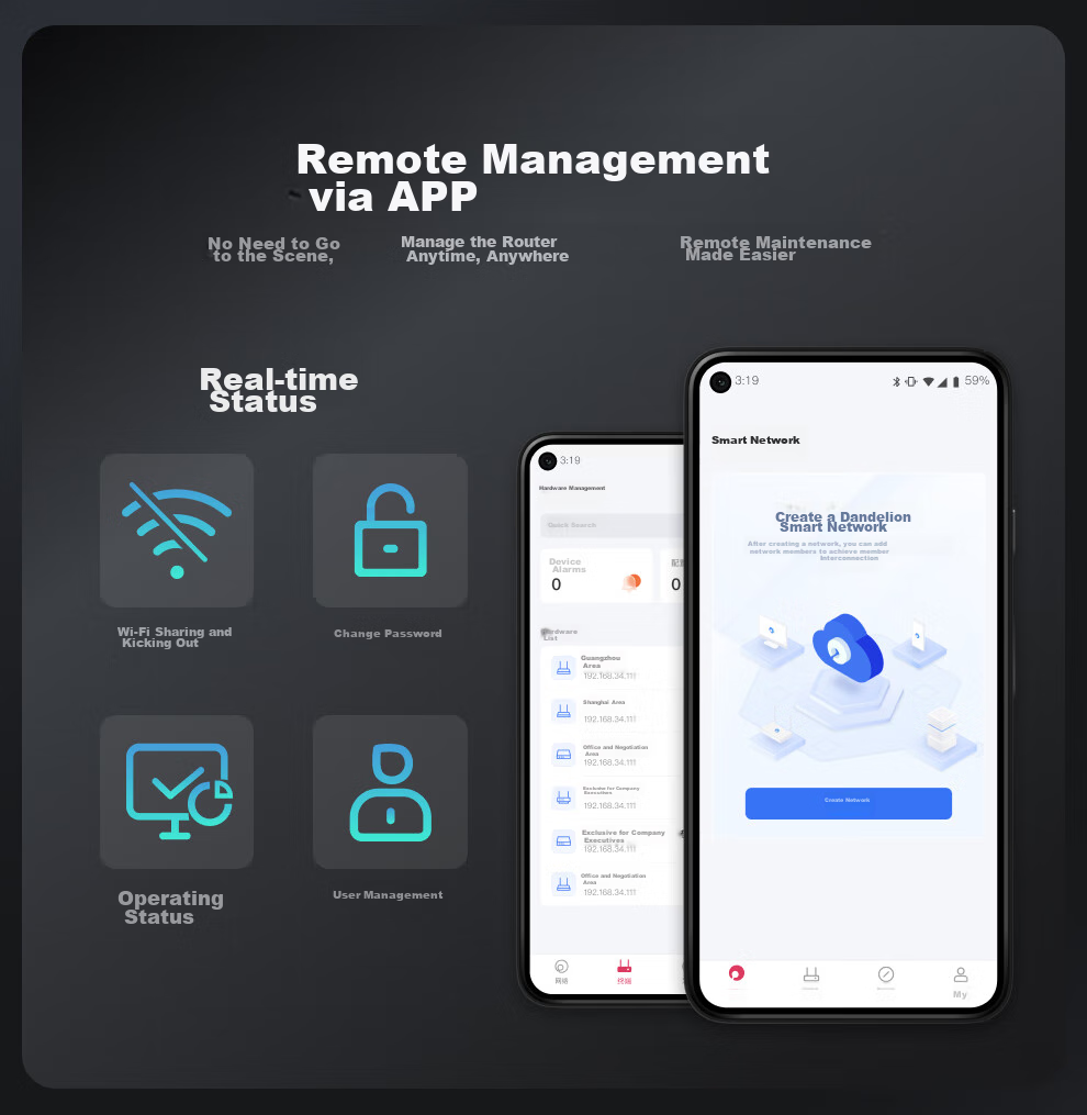 **Remote Management:** App-based remote management, no need for on-site visits, manage the router anytime, anywhere, simplified remote maintenance, real-time status monitoring.
