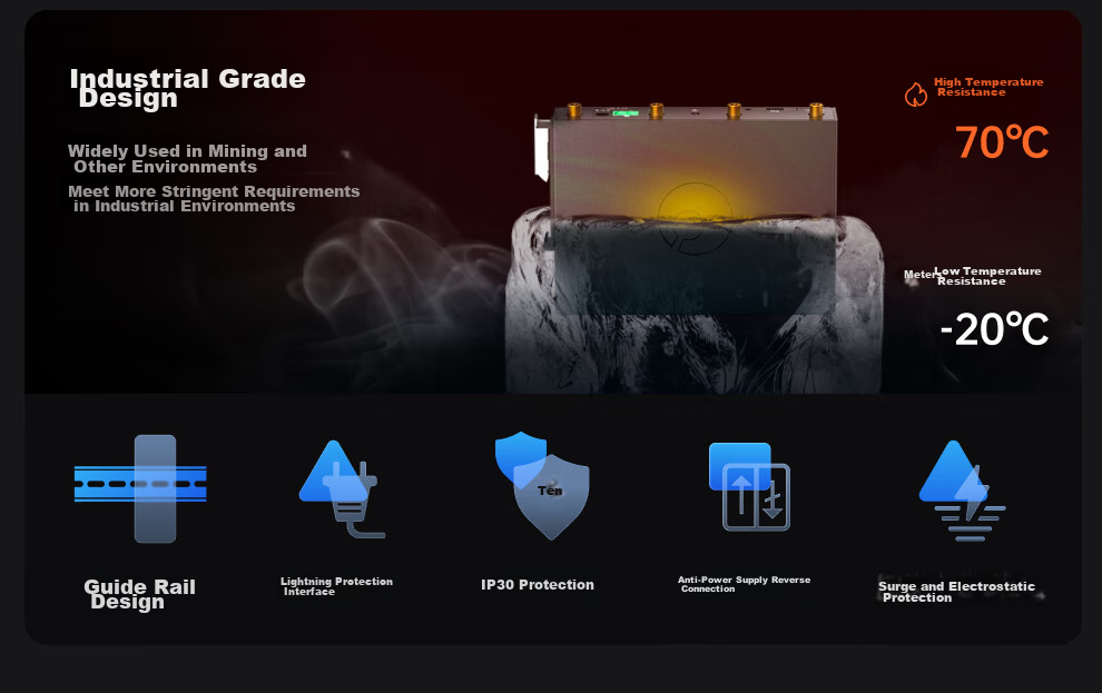 - DIN rail design, lightning protection interface, IP30 protection, anti-reverse power supply, surge and static electricity protection