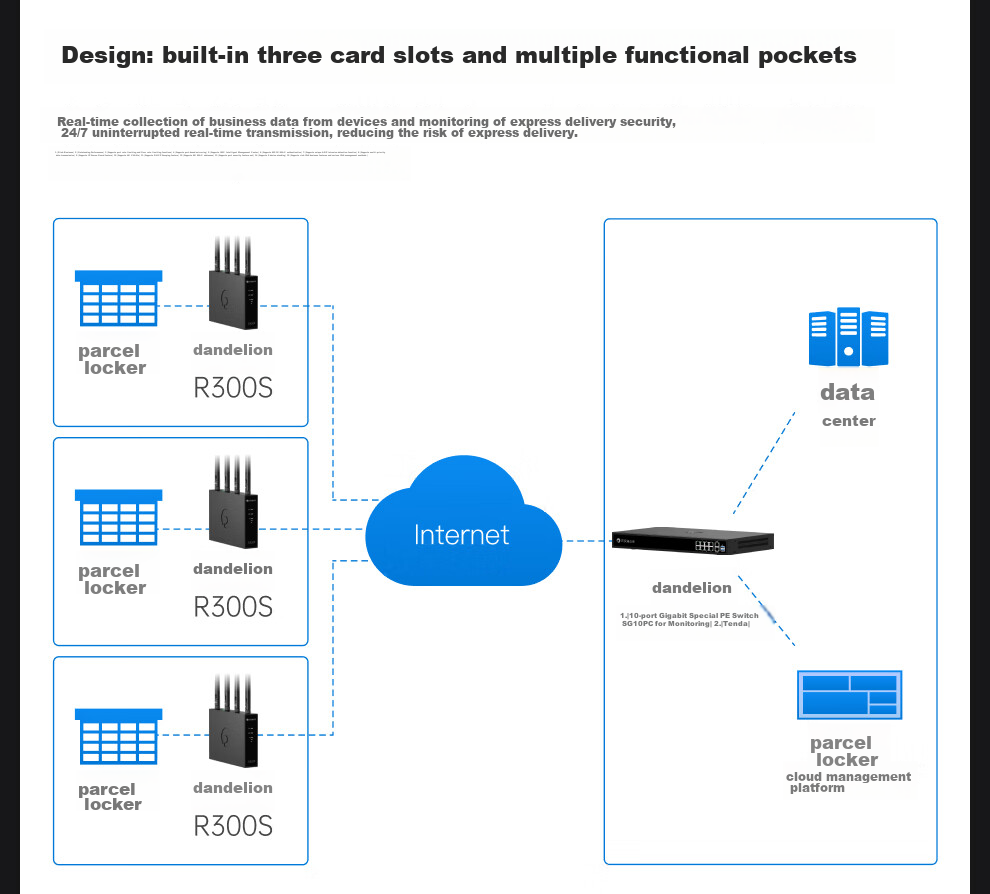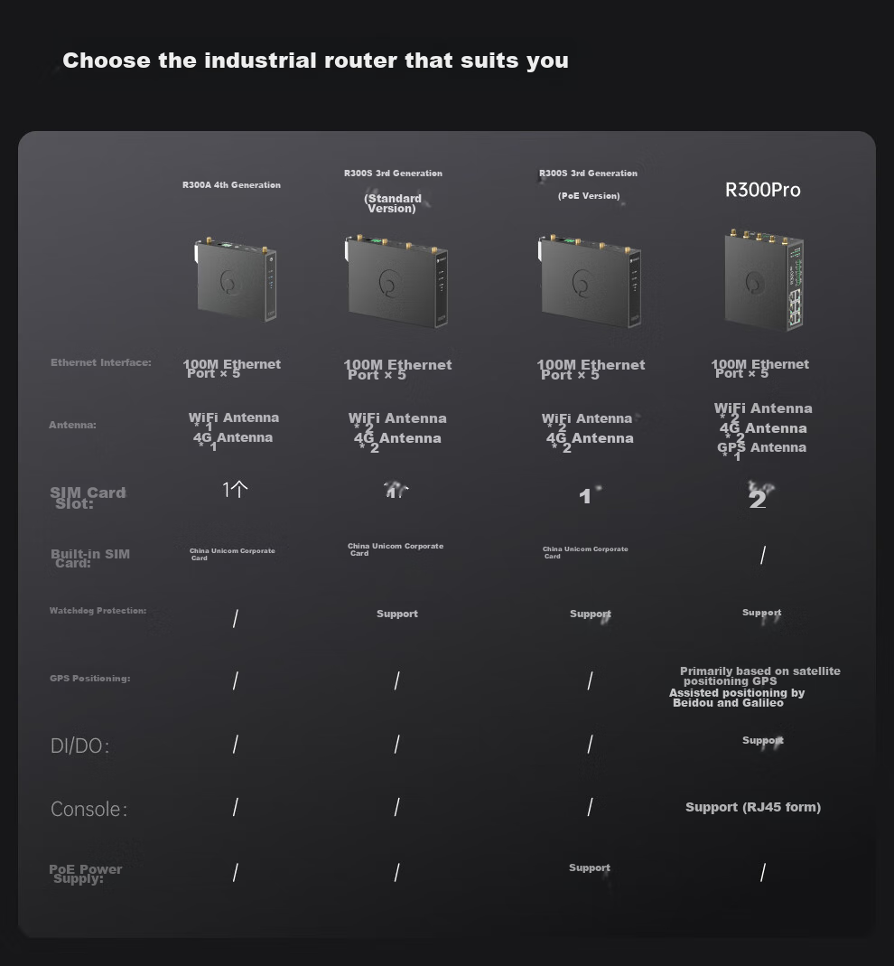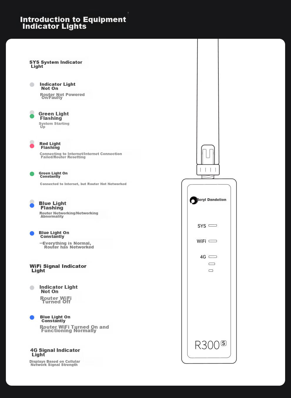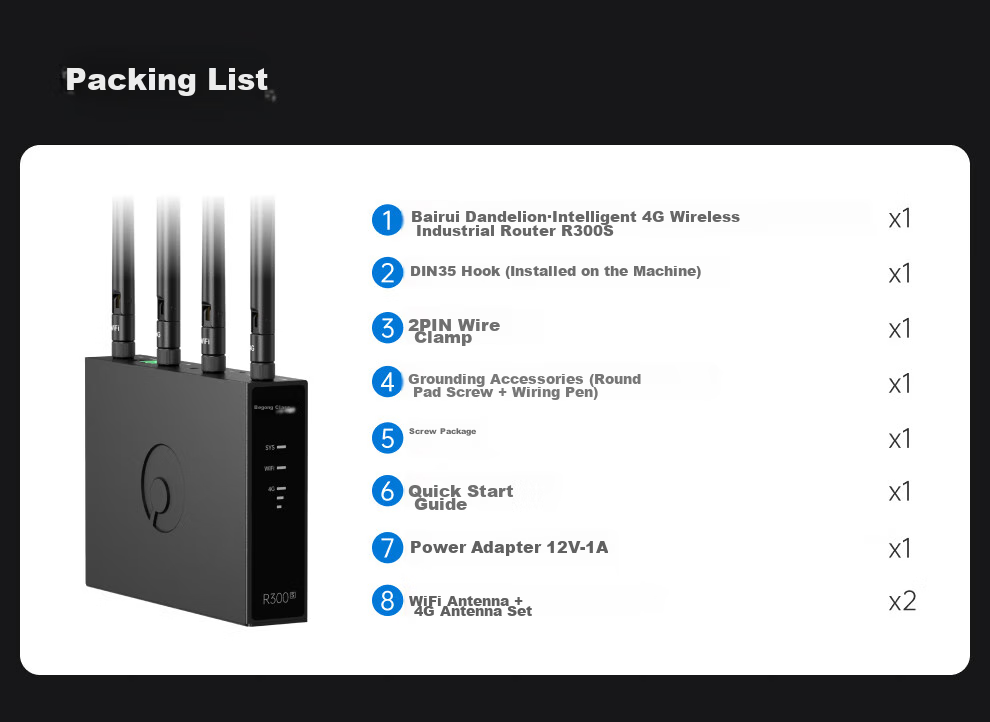 - Package includes: R300S router, mounting accessories, power adapter, antennas, and quick start guide