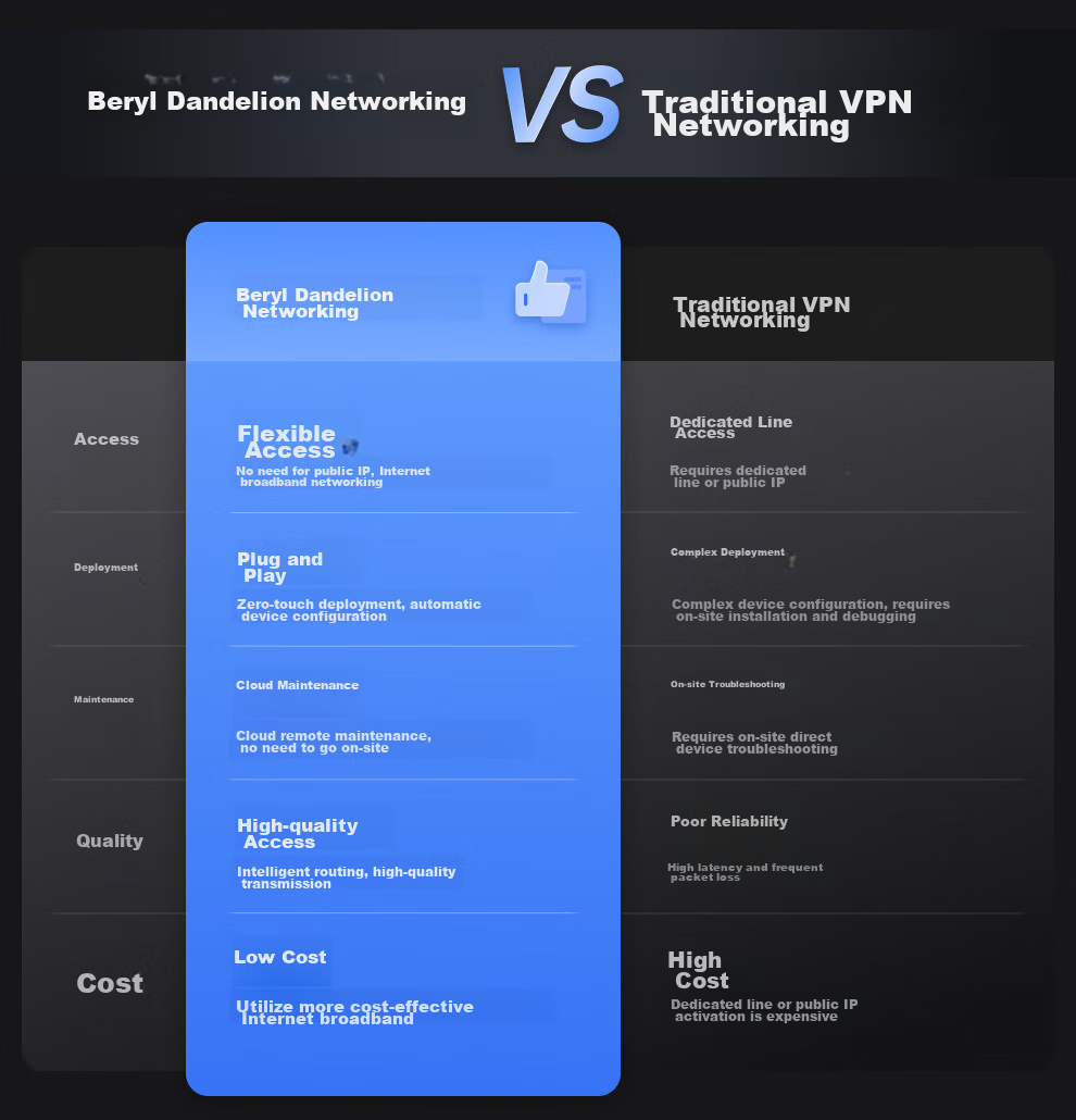 - Flexible access with dedicated line or public IP, no need for public IP for Internet broadband networking
