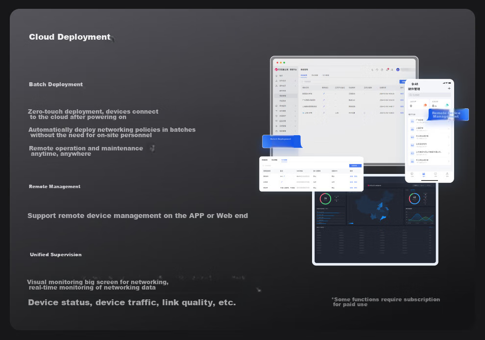 - Cloud deployment for zero-touch deployment, automatic device configuration, remote maintenance, and monitoring