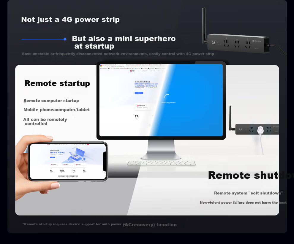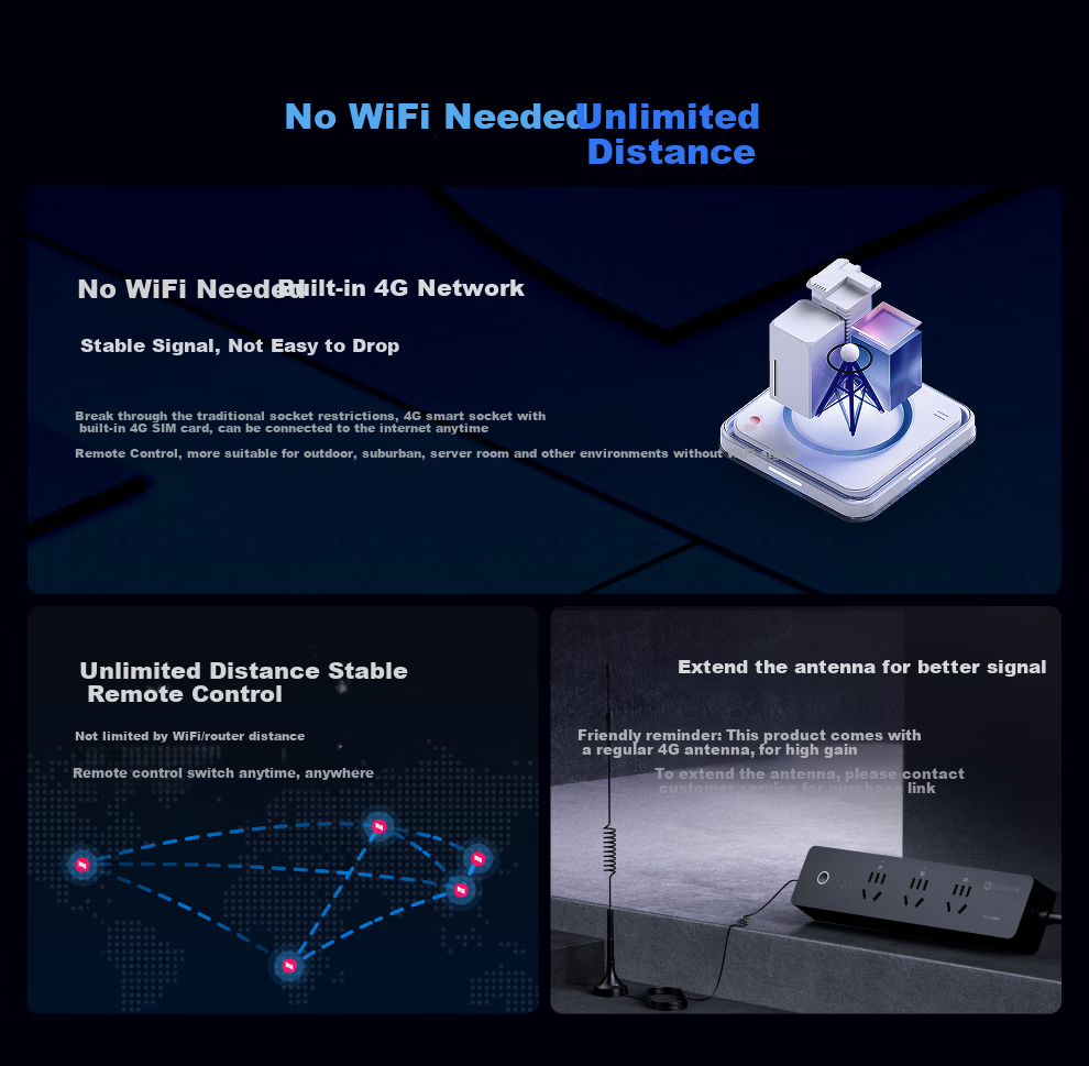 **Features:** No need for WiFi, unlimited remote control distance, built-in 4G SIM card, stable signal, suitable for areas without WiFi signal, remote control, extended antenna for better signal, remote power on/off, supports remote system "soft shutdown" without harming the host, requires device support for AC recovery function.