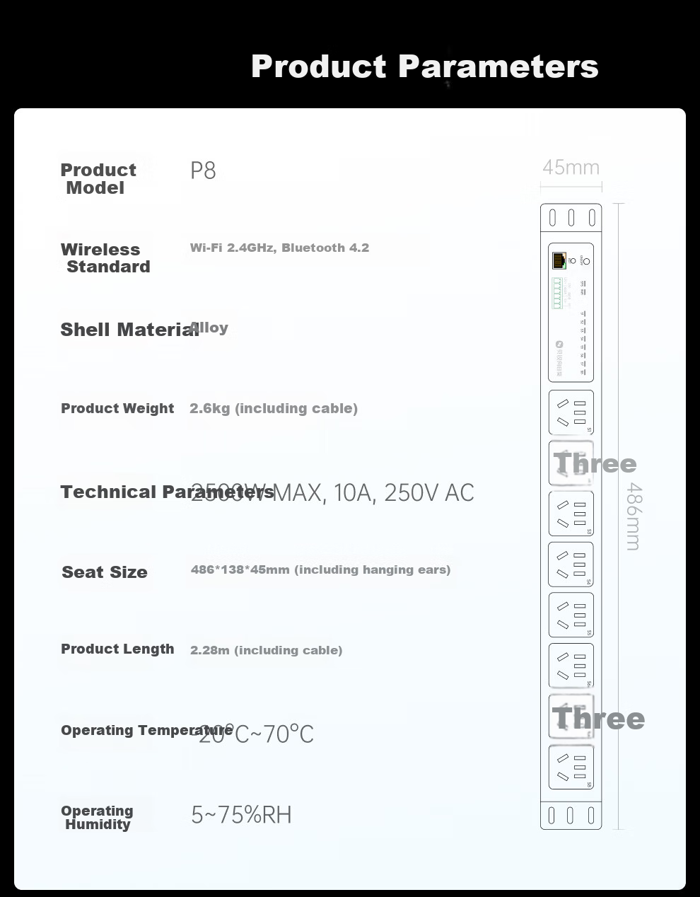 **Dimensions:** 486mm (socket body), 486*138*45mm (including mounting ears), 2.28m (including cable)