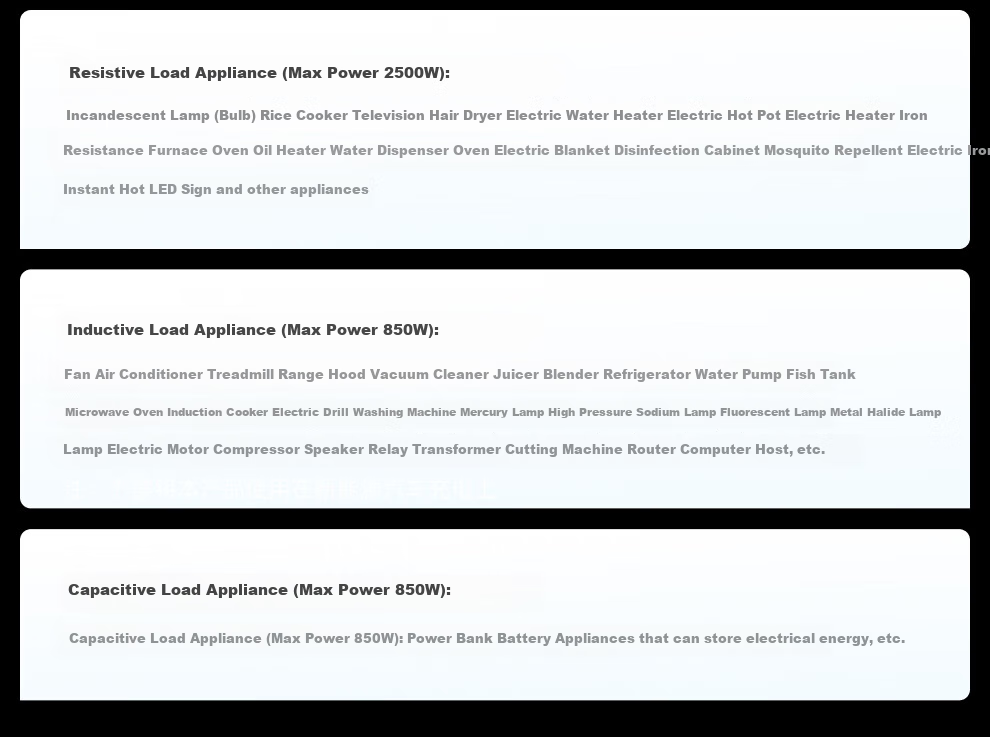 Inductive Load Appliances (max 850W): Fans, air conditioners, treadmills, range hoods, vacuum cleaners, juicers, refrigerators, etc.