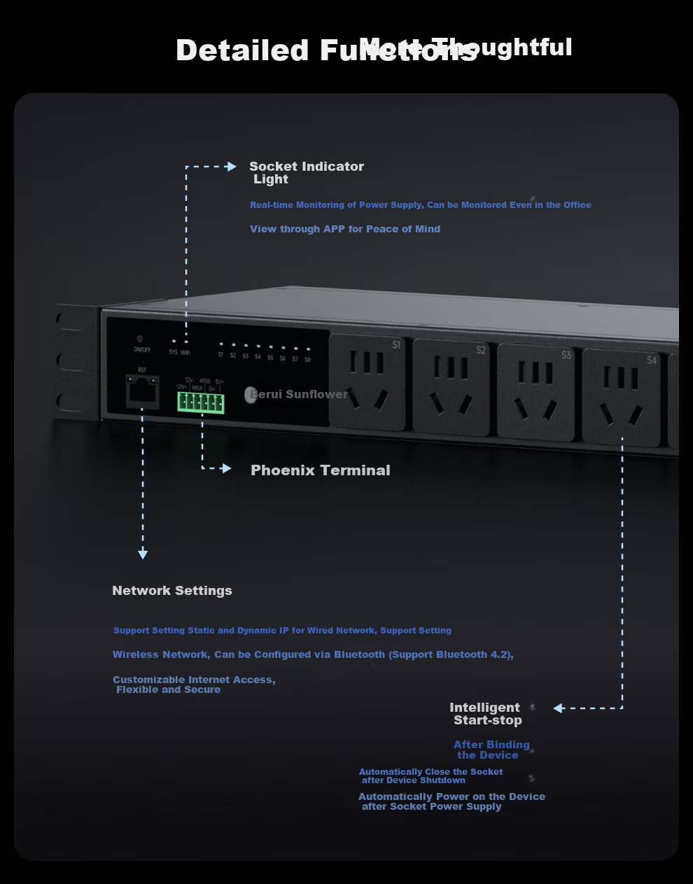 These specifications outline the features, technical details, and safety measures of the Beirui Sunflower P8 smart PDU, designed for efficient power management and remote monitoring in server rooms and industrial settings.
