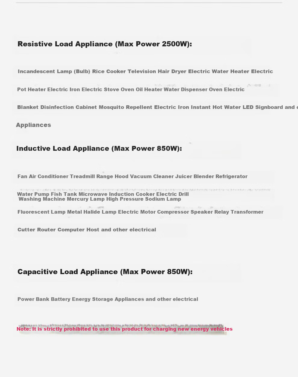 **Capacitive Load Appliances (Max Power 850W):**