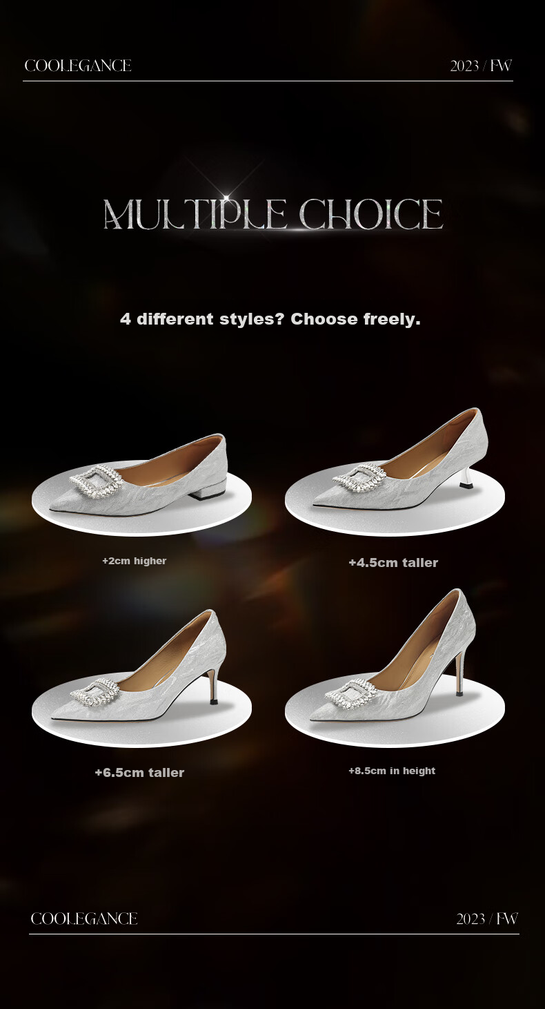 **Heel Options:** 4 heel heights to choose from: +2cm, +4.5cm, +6.5cm, +8.5cm.