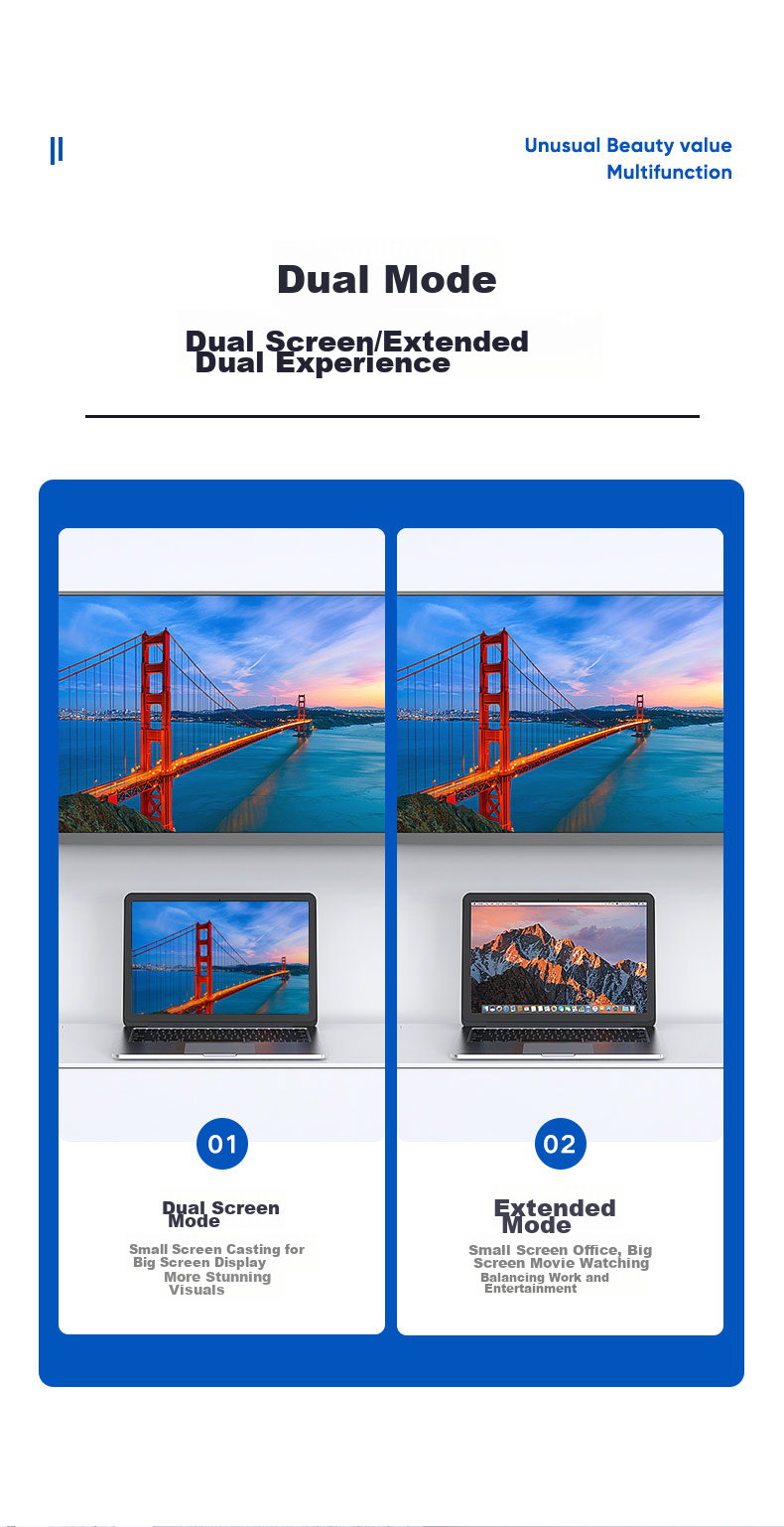 **Dual Mode:** Supports mirror and extended display modes for enhanced viewing experience