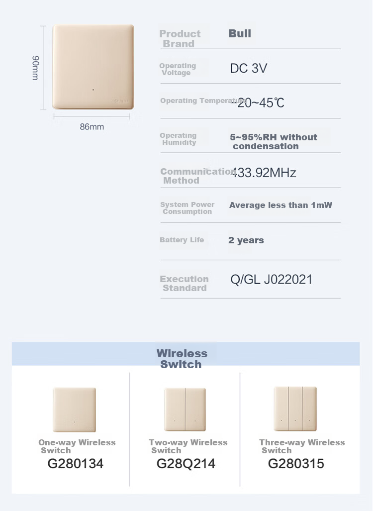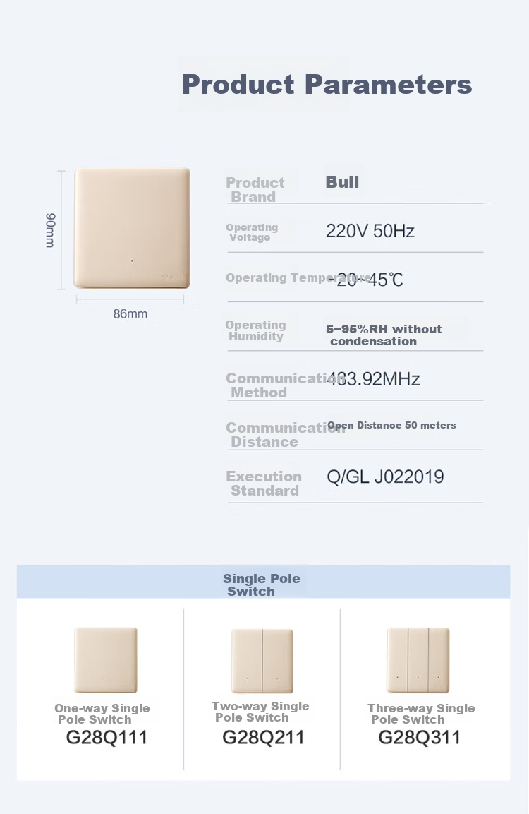 - Standards: Q/GLJ022019 (for single-pole switches), Q/GLJ022021 (for wireless switches)
