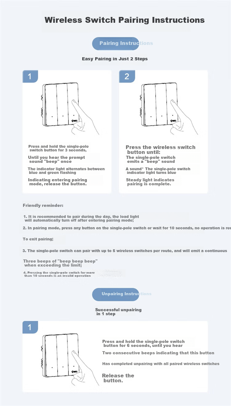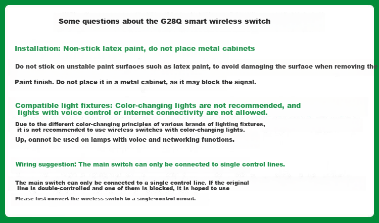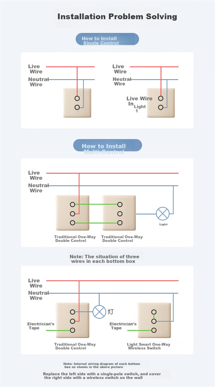 **Compatible Lights:** Not recommended for color-changing or voice-controlled lights. Only suitable for single-control circuits. If replacing a double-control circuit, it is recommended to first convert it to a single-control circuit.