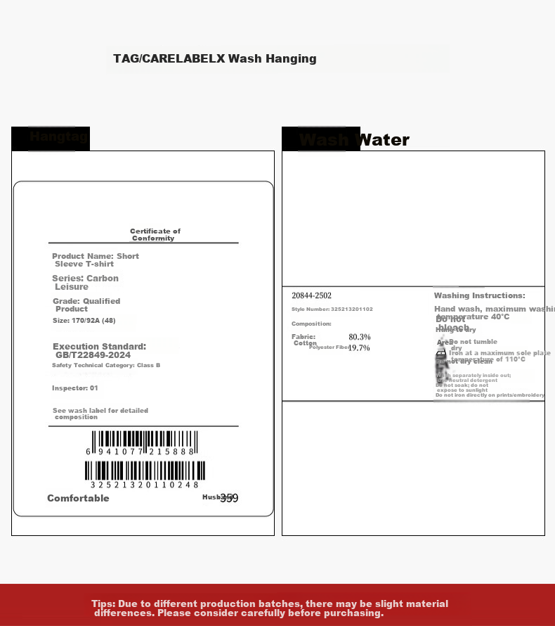 **Care Label:** Wash separately, hang tag, wash water, certificate of conformity