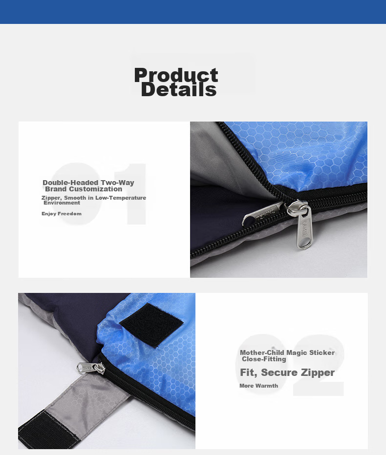 **Details:** Customized double-headed zipper, magic tape for secure closure, suitable for low-temperature environments