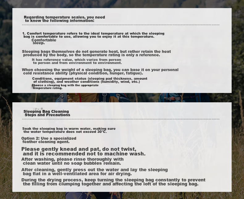 **Note:** The temperature rating is a reference point and may vary based on individual factors such as cold resistance, equipment, and weather conditions. Follow the provided cleaning instructions to maintain the sleeping bag's quality and performance.