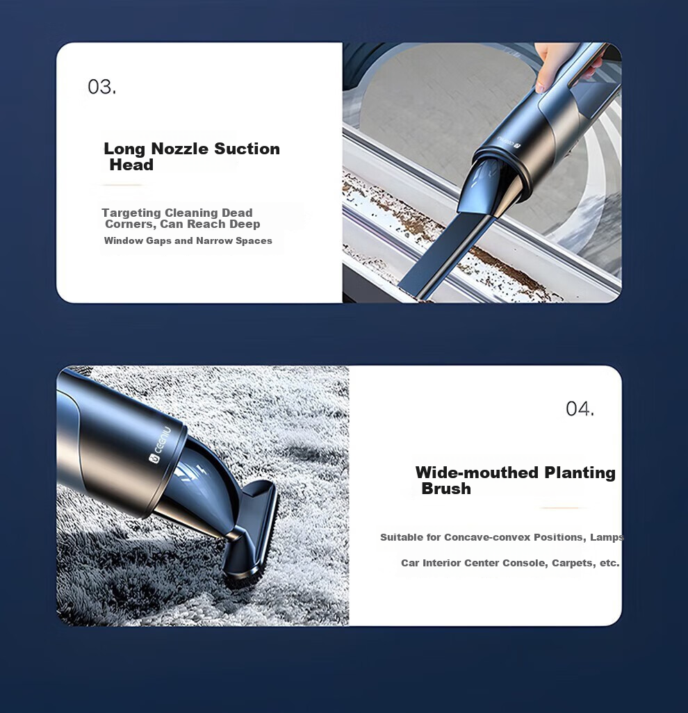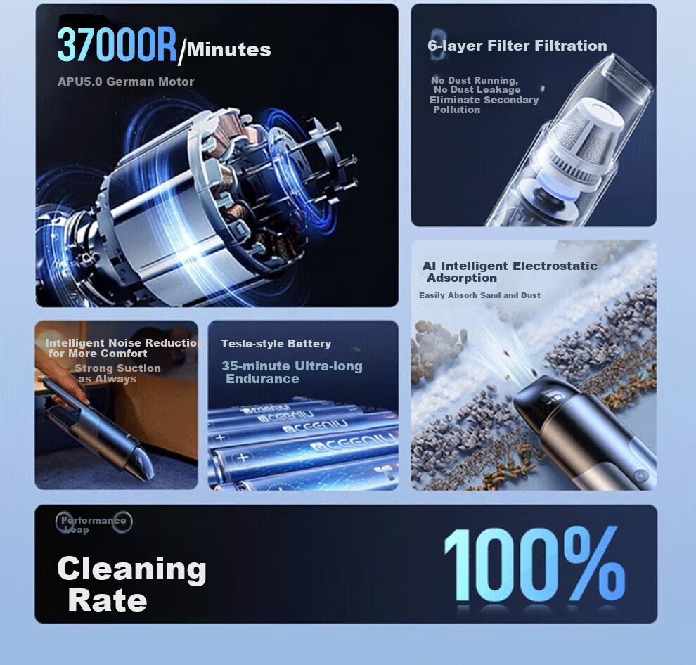 CEENIU introduces the groundbreaking 5th Generation AI Intelligent Vacuum Cleaner, setting new standards in the industry. With features such as powerful suction exceeding 65000PA, long-lasting battery life, advanced filtration system, and innovative noise reduction technology, this vacuum cleaner ensures thorough and efficient cleaning for both car and home environments. Designed to tackle various types of debris, the CEENIU Vacuum Cleaner is a top choice for those seeking high-performance cleaning solutions.