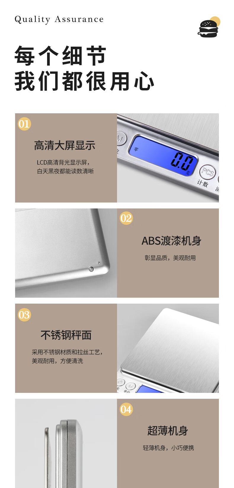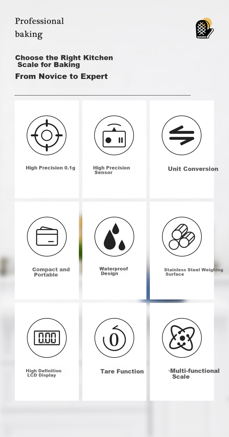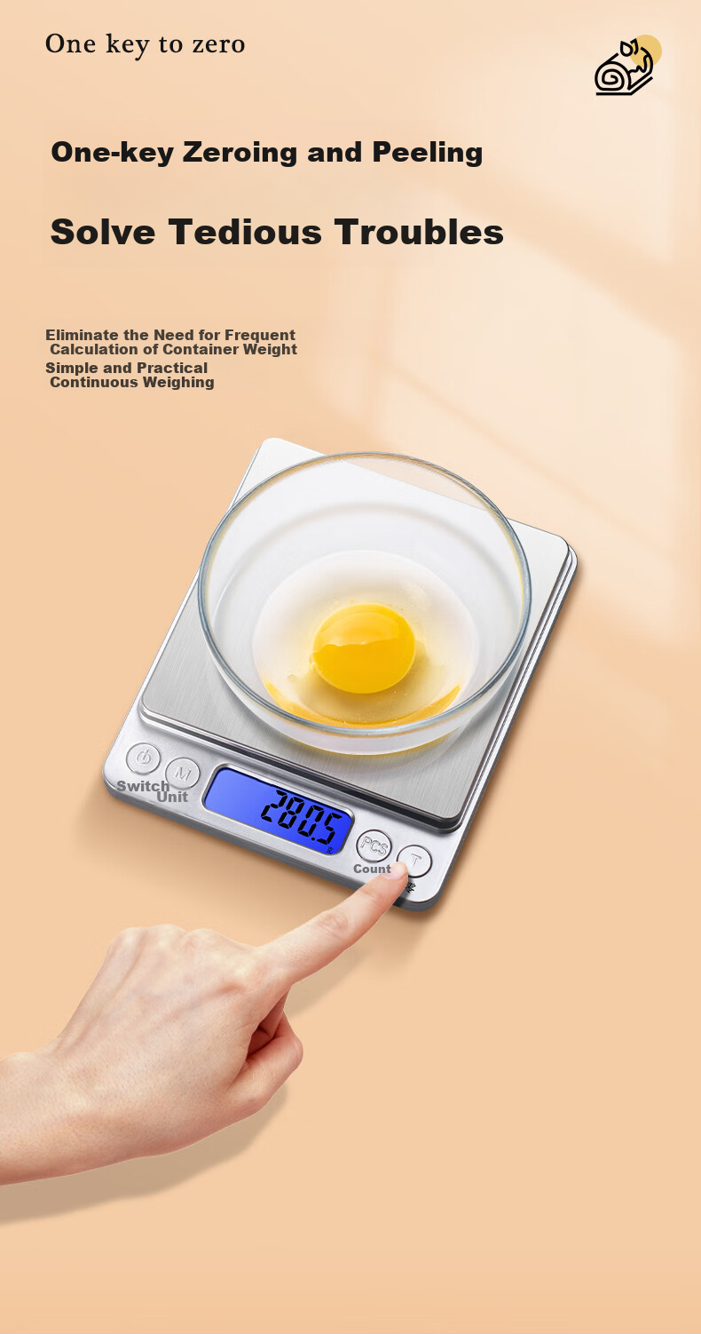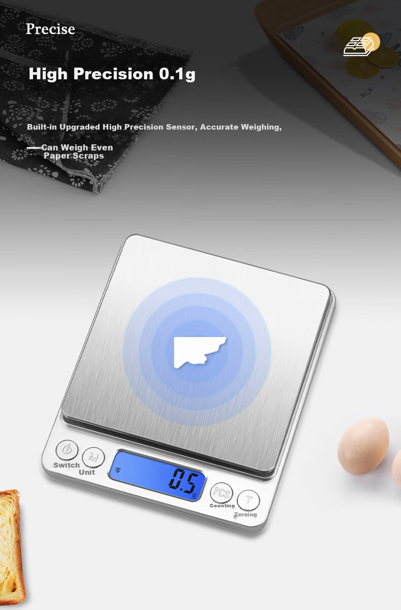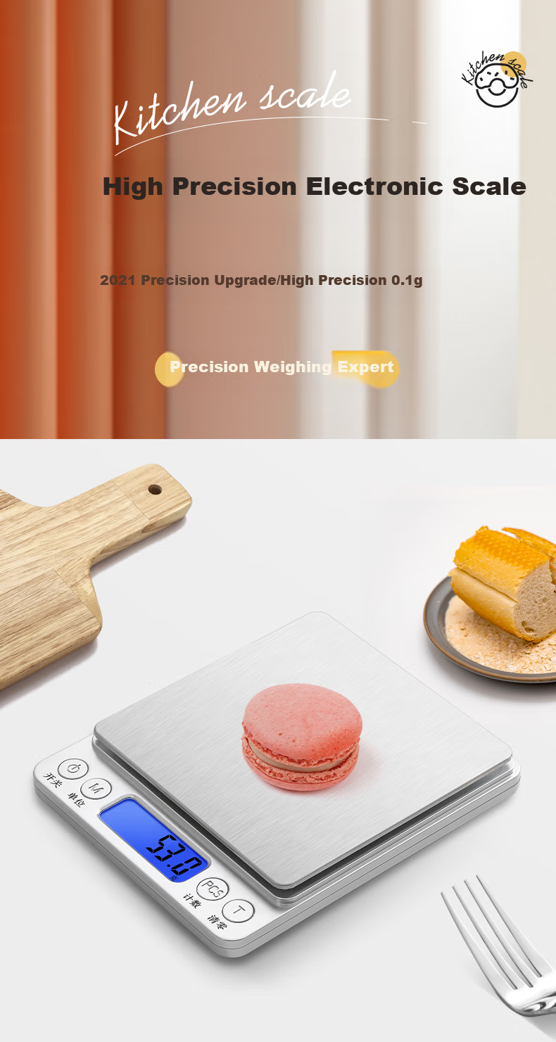**Description:** High-precision electronic scale with 2021 upgrade, featuring high accuracy of 0.1g. Ideal for precise weighing and baking, suitable for beginners and experts alike. Equipped with high-precision sensors, unit conversion, compact and portable design, waterproof feature, stainless steel weighing surface, high-definition LCD display, tare function, and multi-purpose weighing capabilities.