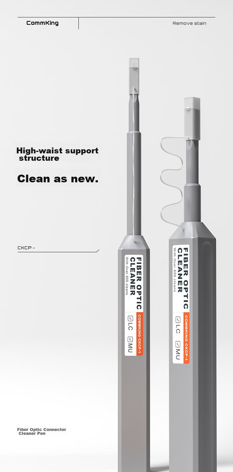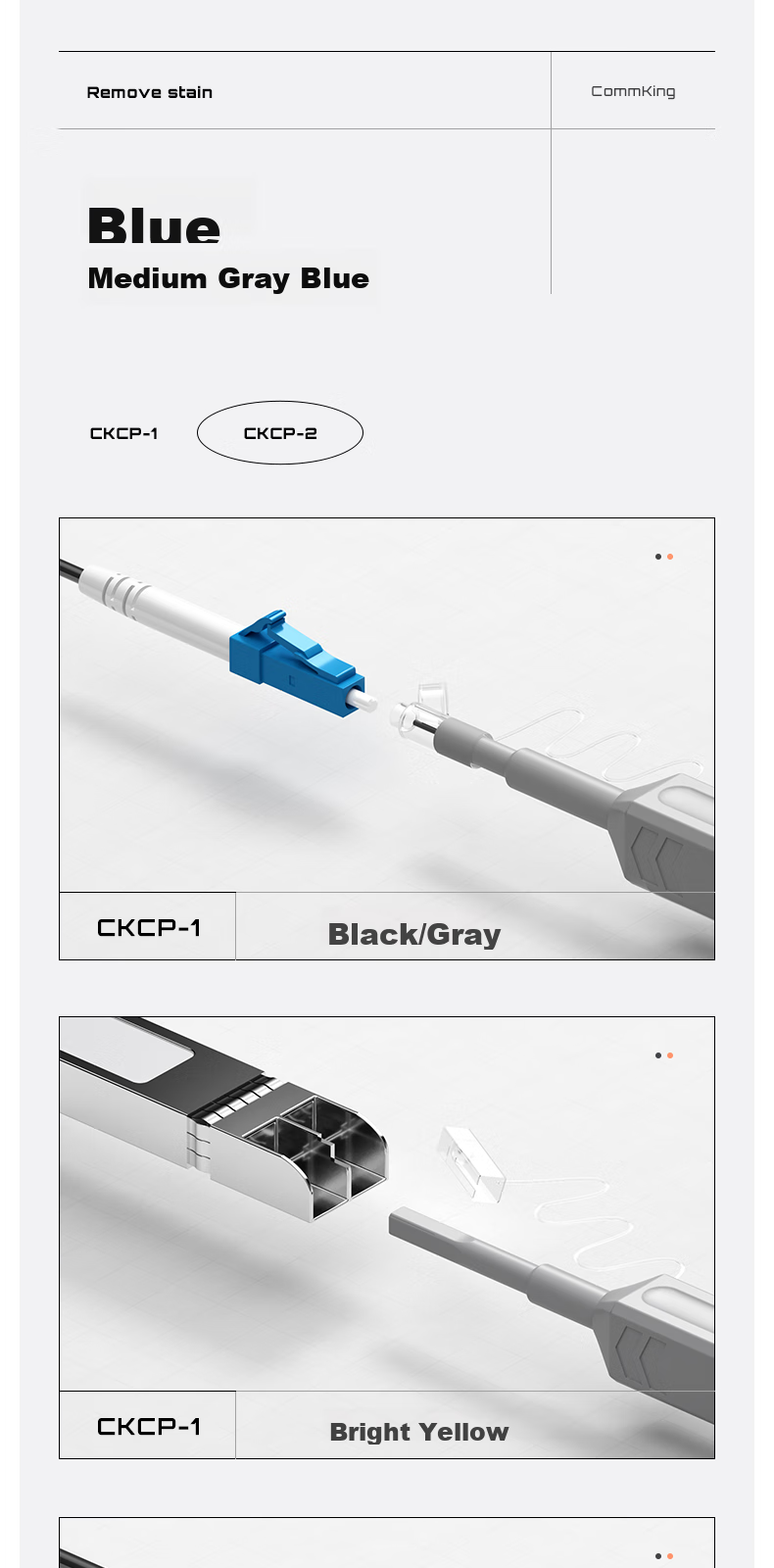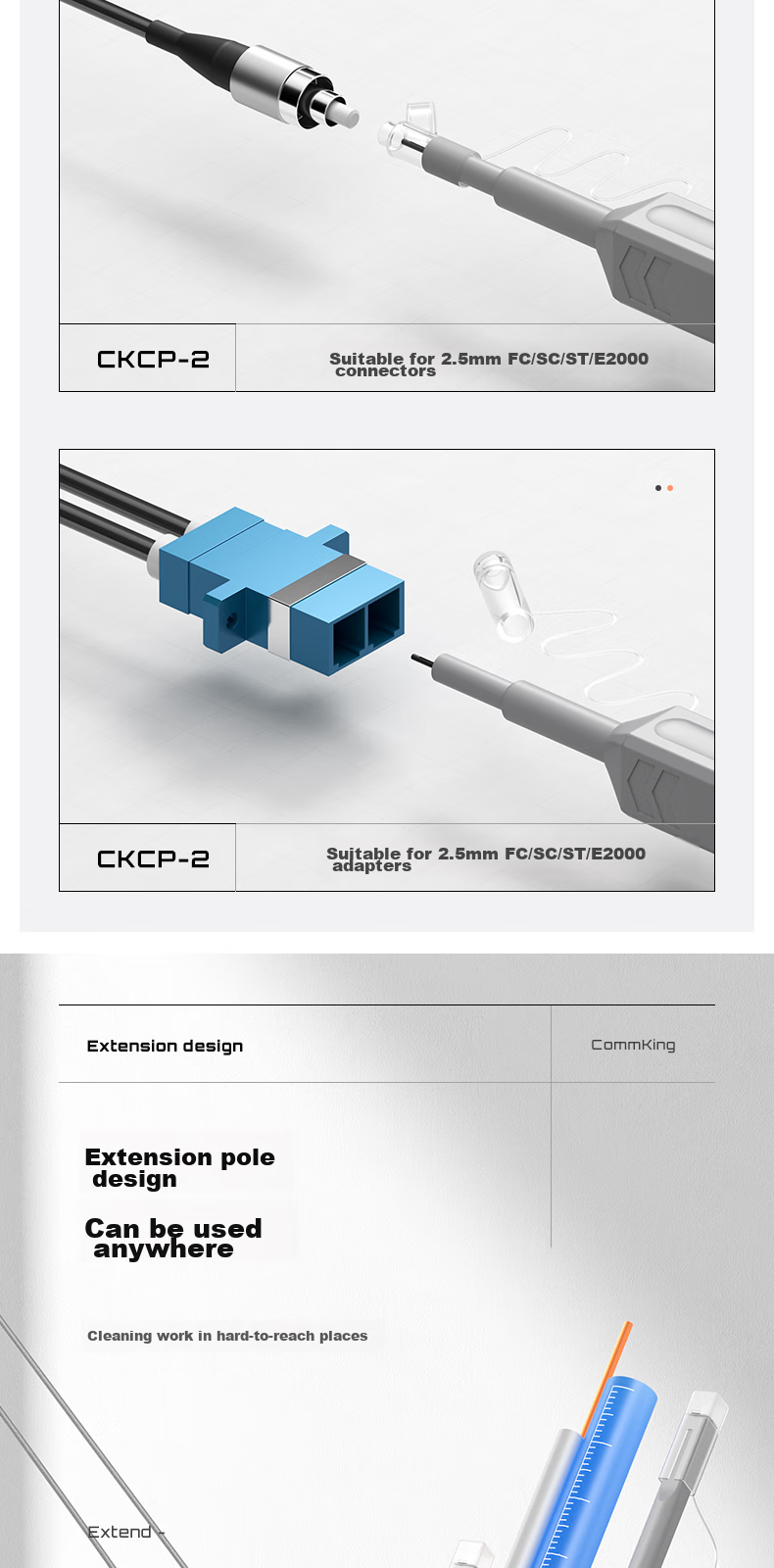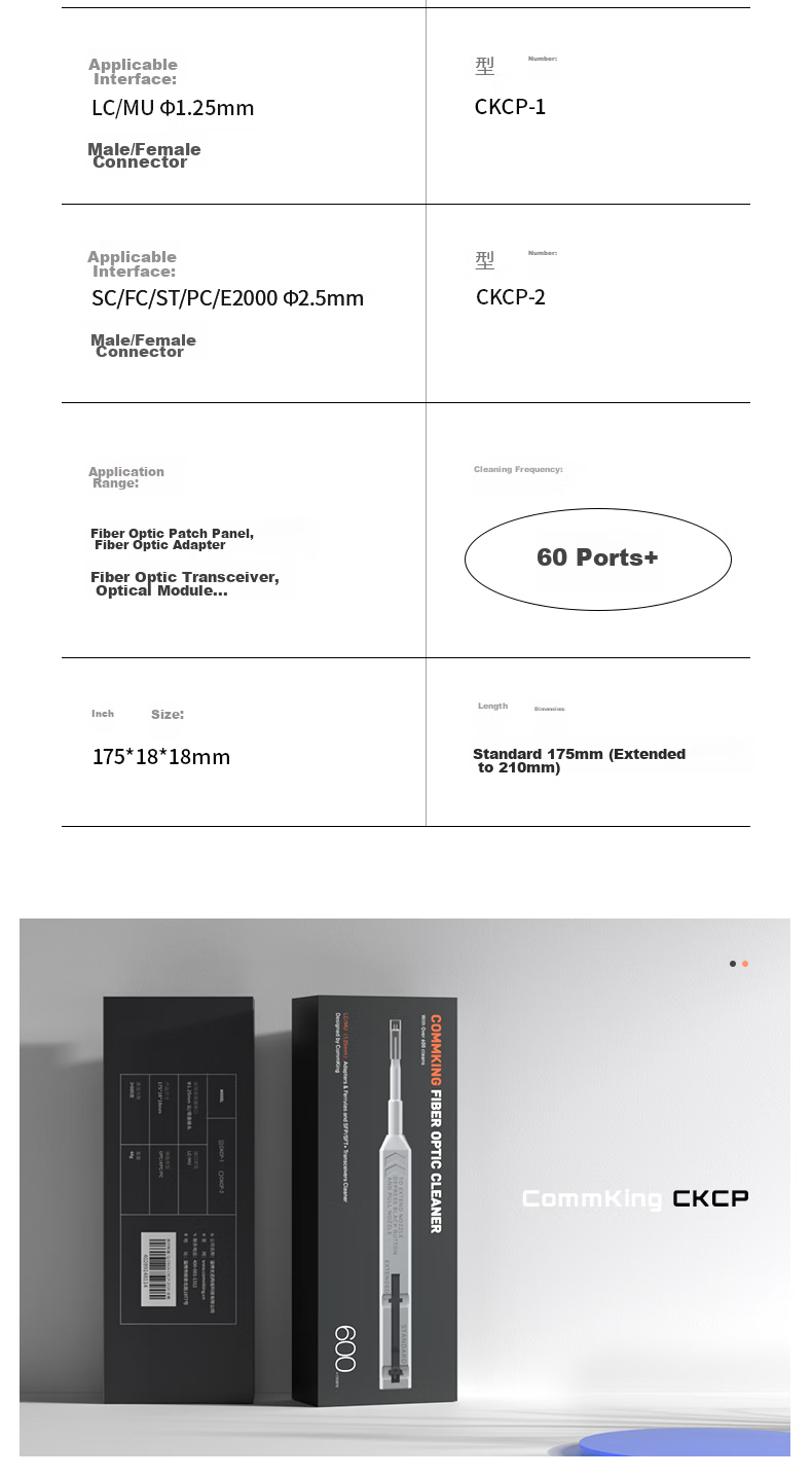 - Two models available: CKCP-1 for 1.25mm LC/MU connectors and adapters, CKCP-2 for 2.5mm FC/SC/ST/E2000 connectors and adapters