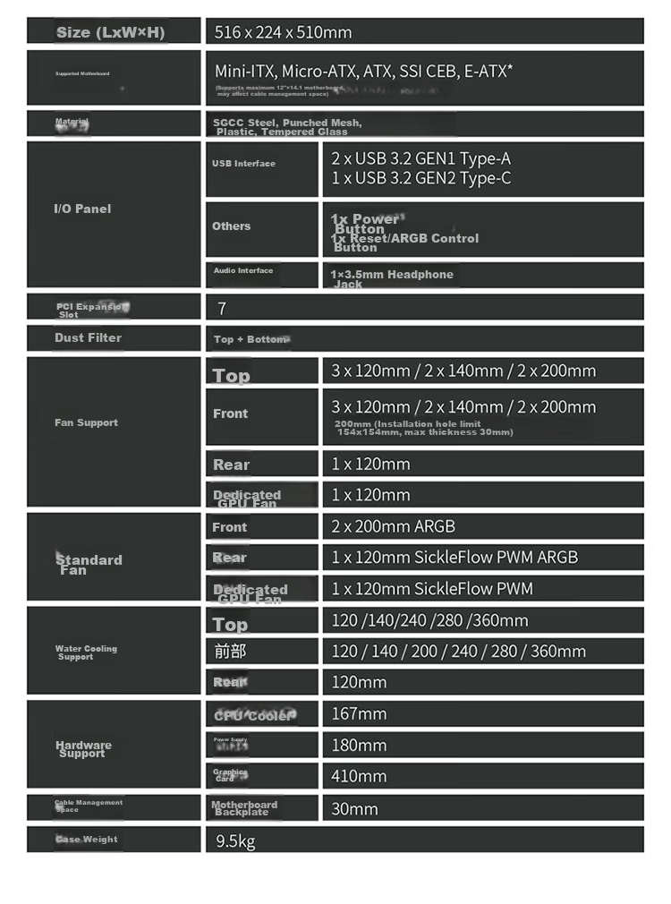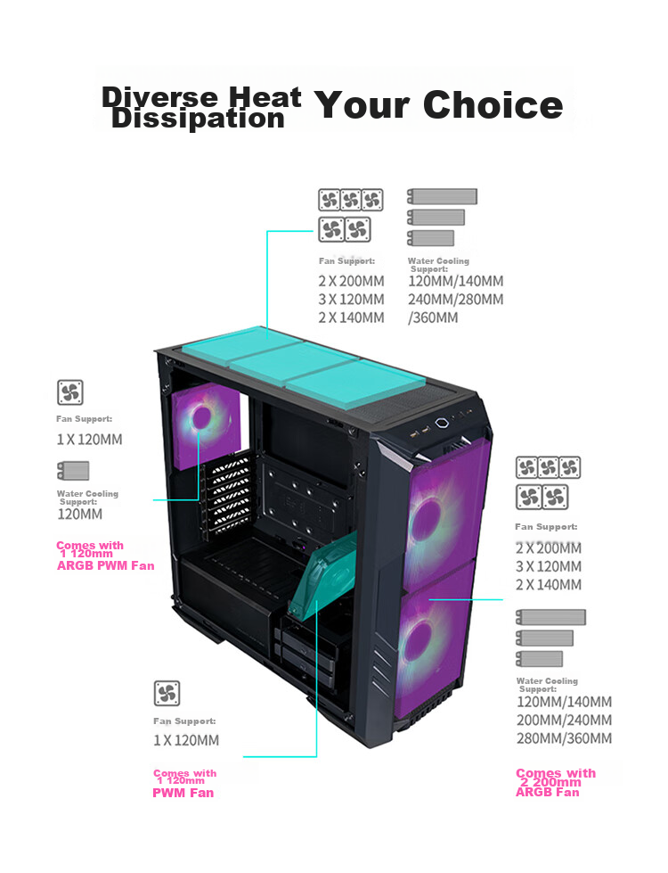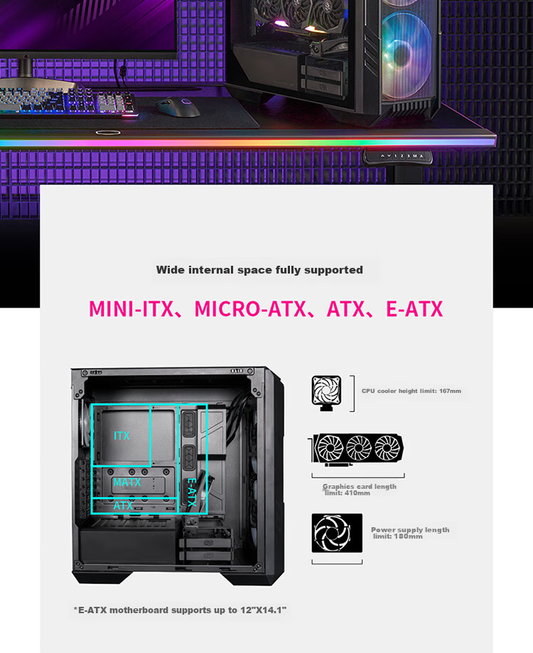 - Motherboard: Mini-ITX, Micro-ATX, ATX, E-ATX (up to 12" x 14.1")