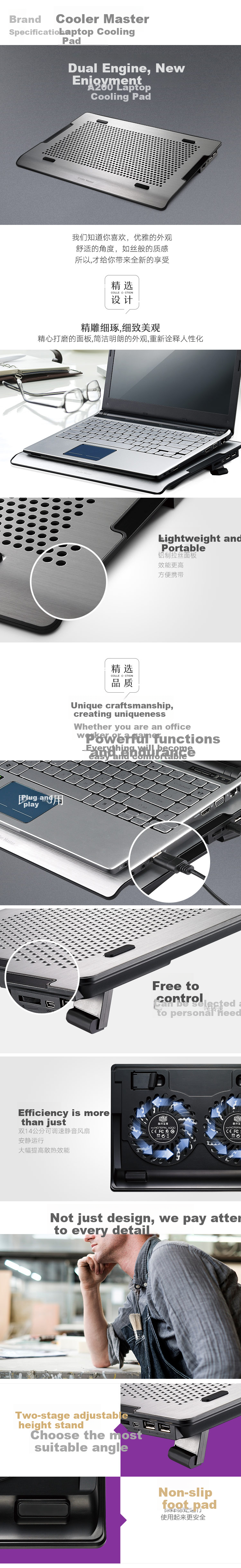 **Description:** CoolerMaster A200 Laptop Cooling Pad is designed for both office and gaming users, providing powerful cooling performance and ergonomic design. It offers a lightweight and portable solution for a comfortable user experience. The cooling pad features a sleek silver aluminum design with ABS plastic accents, equipped with two 140mm fans for efficient heat dissipation. With adjustable angles and a USB hub, it enhances the overall functionality and style of your laptop setup.