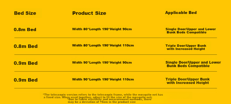 - 0.9m bed: Width 90 * Length 190 * Height 110cm (triple door/upper bunk bed with increased height)