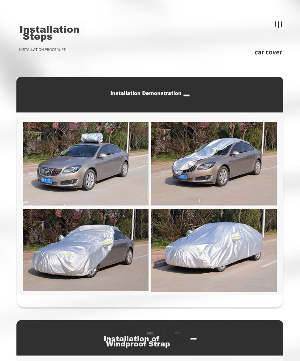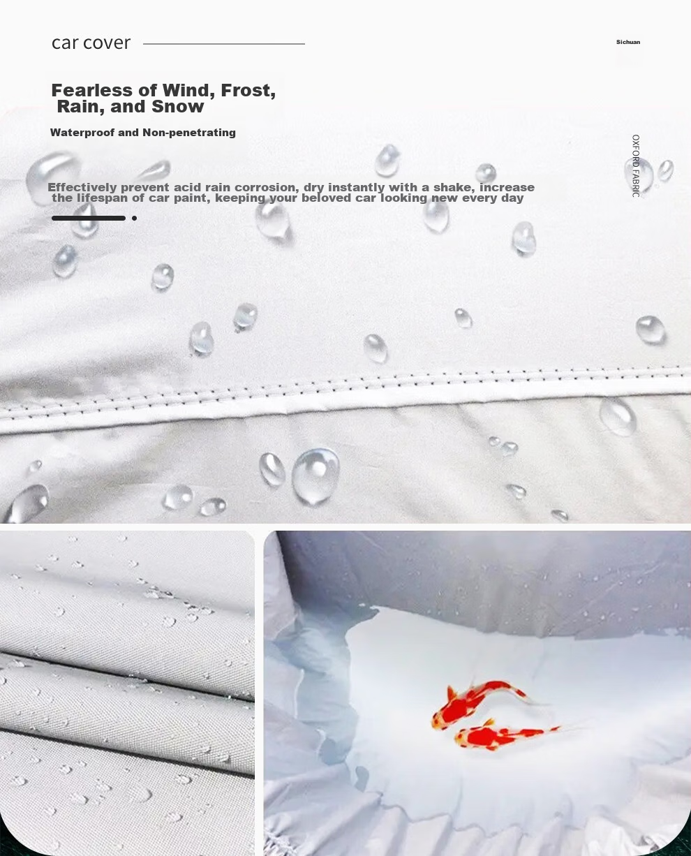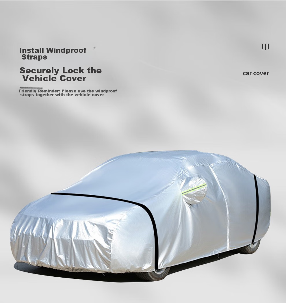 **Usage Tips:** Ensure the car is free of water stains and hard substances before using the car cover. Dry the cover if it gets wet to maintain its longevity. Note that flame retardant does not mean fireproof. Store the car cover folded in a storage bag when not in use.