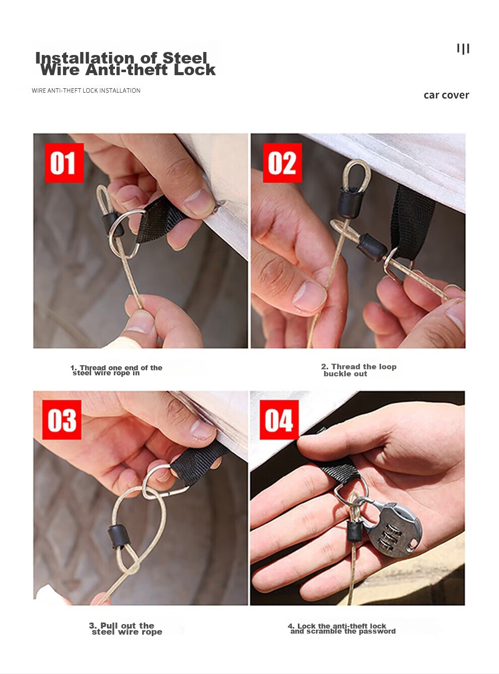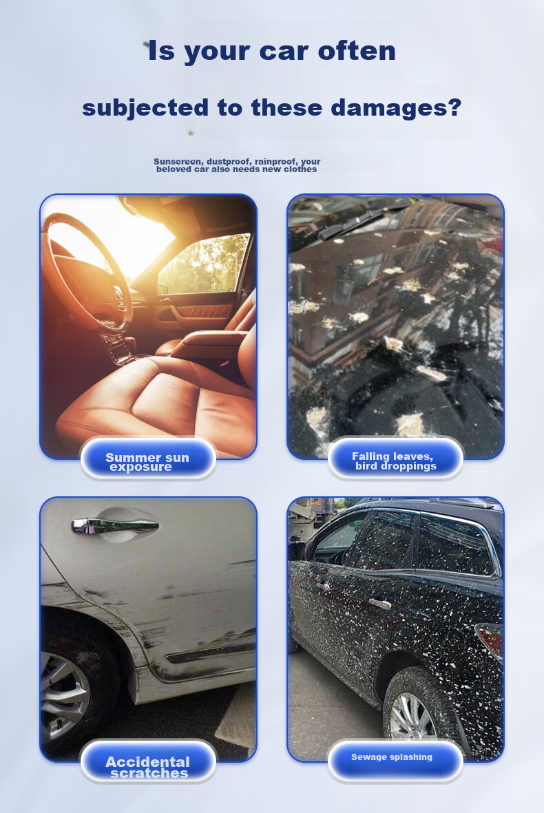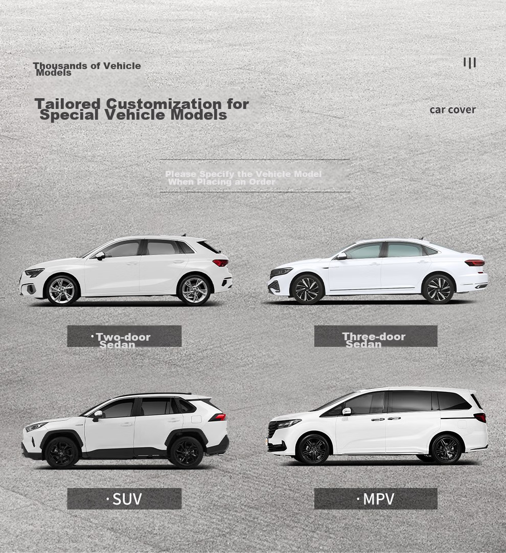 **Usage Tips:** Ensure the car is free of water stains and hard substances before using the car cover. Dry the cover if it gets wet to maintain its longevity. Note that flame retardant does not mean fireproof. Store the car cover folded in a storage bag when not in use.