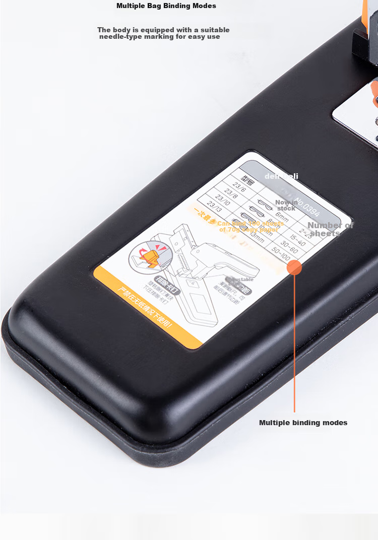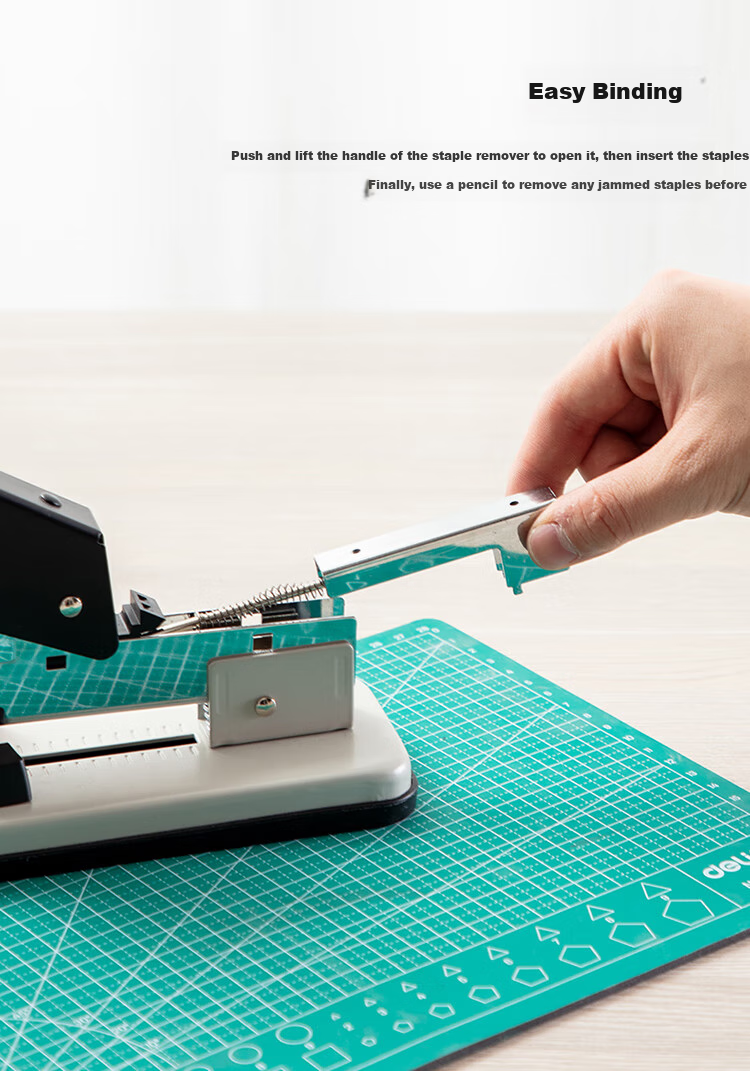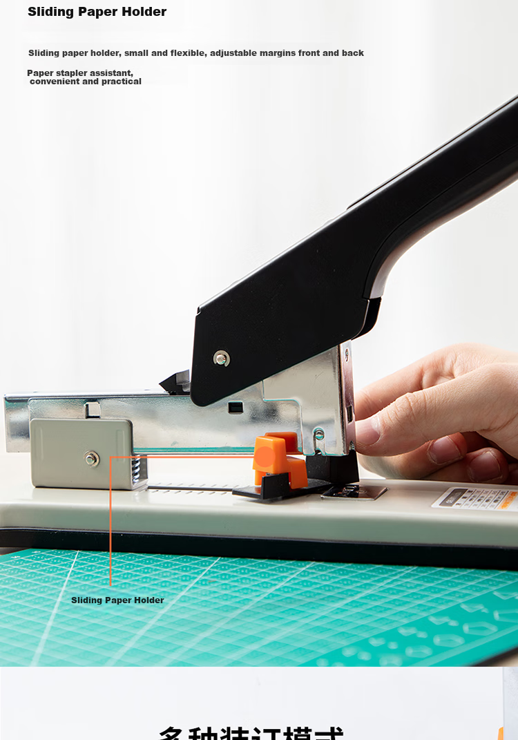 Features: heavy-duty stapler, easy staple replacement, sliding paper guide, multiple binding modes