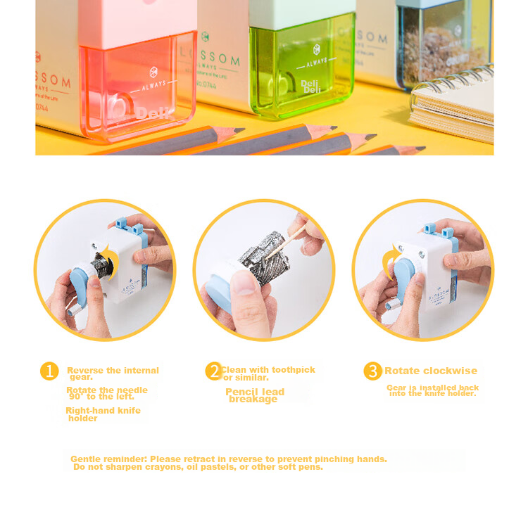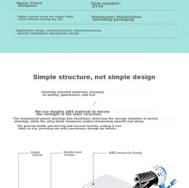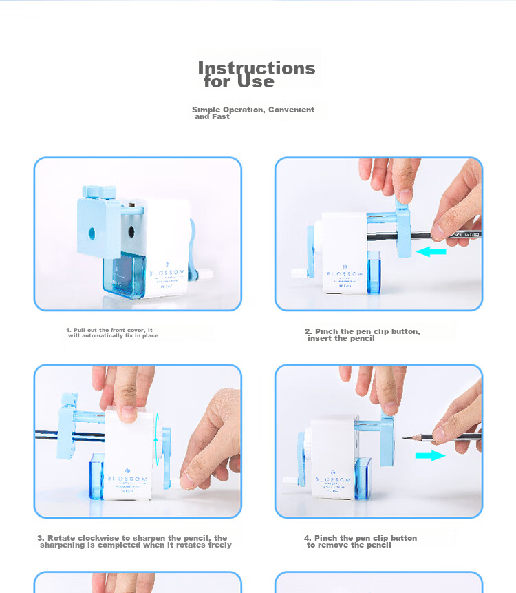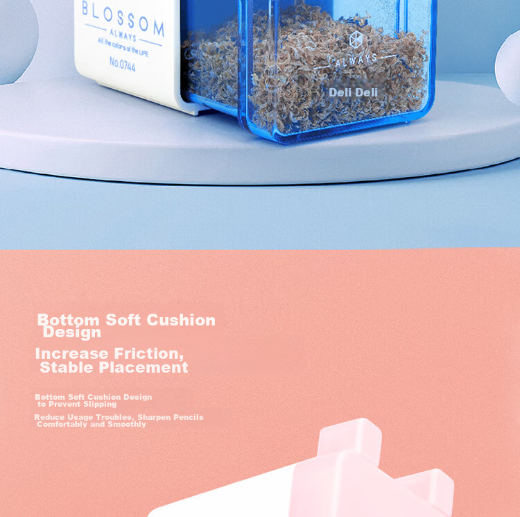 **Features:** Transparent pencil shavings container, anti-slip cushion, alloy blade holder, grooved grip wheel