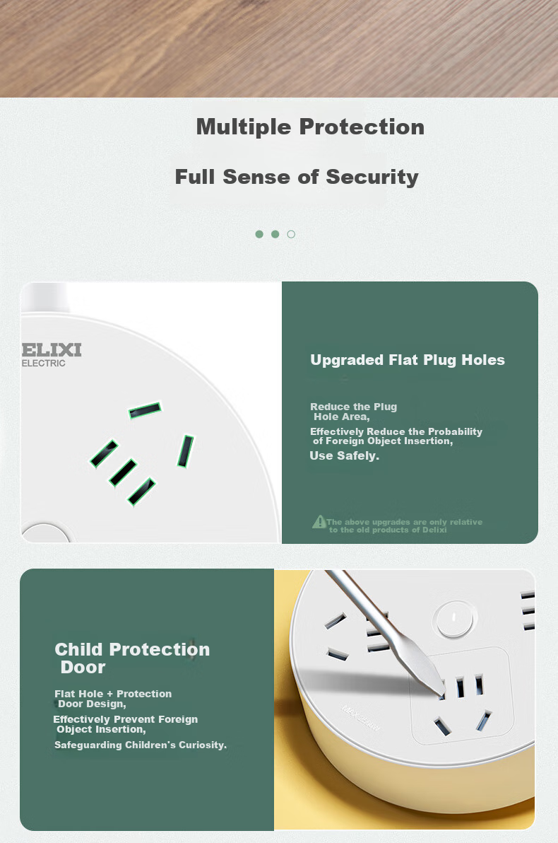 *Note: The above upgrades are only relative to the previous DELIXI products. The child protection door and flat plug + protection door design effectively prevent foreign object insertion, ensuring safety for children.*