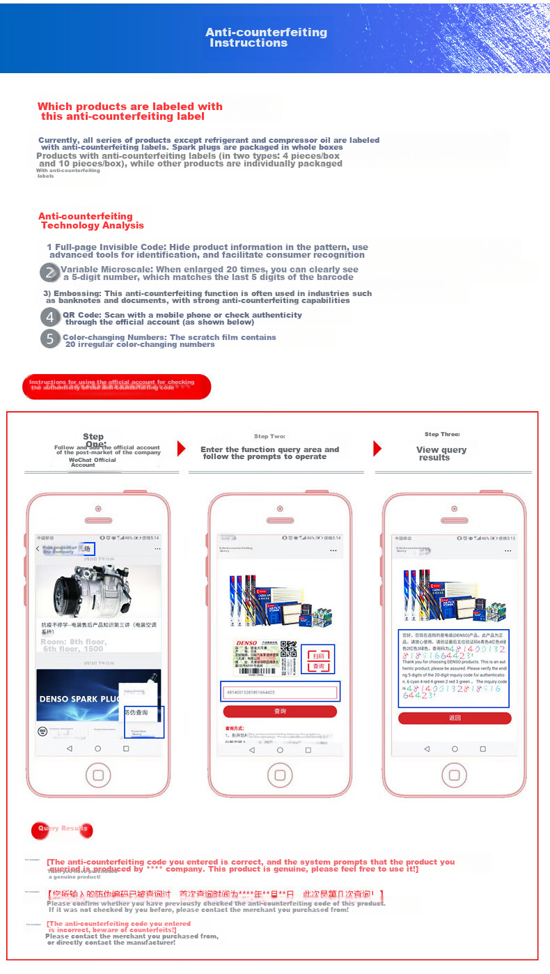 - DENSO products feature anti-counterfeiting labels for authenticity verification.